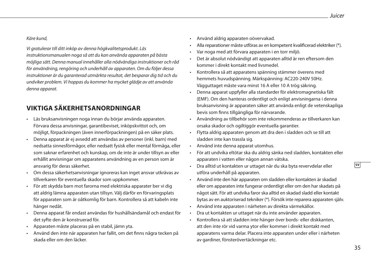 - Använd inte den här apparaten om sladden eller kontakten är skadad eller om apparaten inte fungerar ordentlich erer om den har skadats på nagot sätt. För att undvika faror sca alltid en skadad sladd eller kontakt bytas av en auktoriserad tekniker (). Försök inte reparera apparaten själv.