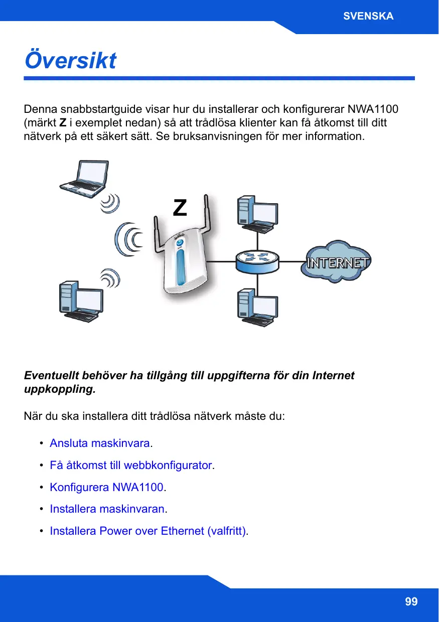 Z Eventuellt behöver ha tillgång till uppgifterna för din Internet uppkoppling. När du ska installera ditt trådlösa nätverk måste du: • Ansluta maskinvara. • Få åtkomst till webbkonfigurator. • Konfigurera NWA1100. • Installera maskinvaran. • Installera Power over Ethernet (valfritt).