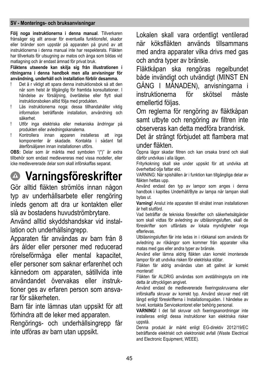 SV - Monterings- och bruksanvisningar Följ noga instruktionerna i denna manual. Tillverkaren frånsäger sig allt ansvar för eventuella funktionsfel, skador eller bränder som uppstår på apparaten på grund av att instruktionerna i denna manual inte har respekterats. Fläkten har tillverkats för utsugning av matos och ånga som bildas vid matlagning och är endast ämnad för privat bruk. Fläktens utseende kan skilja sig från illustrationen i ritningarna i denna handbok men alla anvisningar för användning, underhåll och installation förblir desamma. Det ä r viktigt att spara denna instruktionsbok så att den när som helst är tillgänglig för framtida konsultationer. I händelse av försäljning, överlåtelse eller flytt skall instruktionsboken alltid följa med produkten. Läs instruktionerna noga: dessa tillhandahåller viktig information beträffande installation, användning och säkerhet. Utför inga elektriska eller mekaniska ändringar på produkten eller avledningskanalerna. Kontrollera innan apparen installeras att inga komponenter är skadade. Kontakta i sådant fall återförsäljaren innan installationen utförs. OBS: Delar som är märkta med symbolen “(*)” är extra tillbehör som endast medlevereras med vissa modeller, eller icke medlevererade delar som skall införskaffas separat. Lokalen skall vara ordentligt ventilerad när köksfläkten används tillsammans med andra apparater vilka drivs med gas och andra typer av bränsle. Fläktkåpan ska rengöras regelbundet både invändigt och utvändigt (MINST EN GÅNG I MÅNADEN), anvisningarna i instruktionerna för skötsel måste emellertid följas. Om reglerna för rengöring av fläktkåpan samt utbyte och rengöring av filtren inte observeras kan detta medföra brandrisk. Det är strängt förbjudet att flambera mat under fläkten. Öppna lågor skadar filtren och kan orsaka brand och skall därför undvikas i alla lägen. Frityrkokning skall ske under uppsikt för att undvika att överhettad olja fattar eld. VARNING: När spishällen är i funktion kan tillgängliga delar av fläkten hettas upp. Använd endast den typ av lampor som anges i denna handbok i kapitles Underhåll/Byte av lampa när lampan skall bytas ut. Varning! Anslut inte apparaten till elnätet innan installationen är helt slutförd. Vad beträffar de tekniska föreskrifter och säkerhetsåtgärder som skall vidtas för avledning av utblåsningsluften, skall de föreskrifter som utfärdats av lokala myndigheter noga efterlevas. Utblåsningsluften får inte ledas in i rökkanal som används för avledning av rökångor som kommer från apparater vilka matas med gas eller andra typer av bränsle. Använd eller lämna aldrig fläkten utan korrekt imonterade lampor för att undvika risken för elektriska stötar. Fläkten får aldrig användas utan att gallret är korrekt monterat! Fläkten får ALDRIG användas som avställningsyta om inte detta är uttryckligen angivet. Använd endast de medlevererade fixeringsskruvarna eller införskaffa skruvar av korrekt typ. Använd skruvar med rätt längd enligt föreskrifterna i Installationsguiden. I händelse av tvivel, kontakta Servicekontoret eller behörig personal. VARNING! I det fall skruvar och fixeringsanordningar inte installeras enligt dessa instruktioner kan elektriska risker uppstå. Denna produkt är märkt enligt EG-direktiv 2012/19/EC beträffande elektriskt och elektroniskt avfall (Waste Electrical and Electronic Equipment, WEEE). Varningsföreskrifter Gör alltid fläkten strömlös innan någon typ av underhållsarbete eller rengöring inleds genom att dra ur kontakten eller slå av bostadens huvudströmbrytare. Använd alltid skyddshandskar vid installation och underhållsingrepp. Apparaten får användas av barn från 8 års ålder eller personer med reducerad rörelseförmåga eller mental kapacitet, eller personer som saknar erfarenhet och kännedom om apparaten, såtillvida inte användandet övervakas eller instruktioner ges av erfaren person som ansvarar för säkerheten. Barn får inte lämnas utan uppsikt för att förhindra att de leker med apparaten. Rengörings- och underhållsingrepp får inte utföras av barn utan uppsikt.