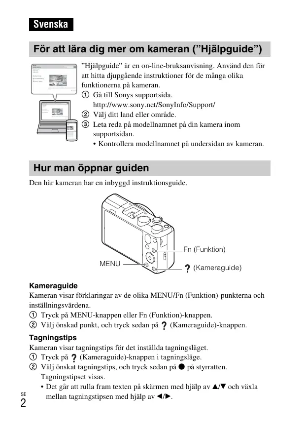 Svenska För att lära dig mer om kameran (”Hjälpguide”) ”Hjälpguide” är en on-line-bruksanvisning. Använd den för att hitta djupgående instruktioner för de många olika funktionerna på kameran. 1 Gå till Sonys supportsida. http://www.sony.net/SonyInfo/Support/ 2 Välj ditt land eller område. 3 Leta reda på modellnamnet på din kamera inom supportsidan.