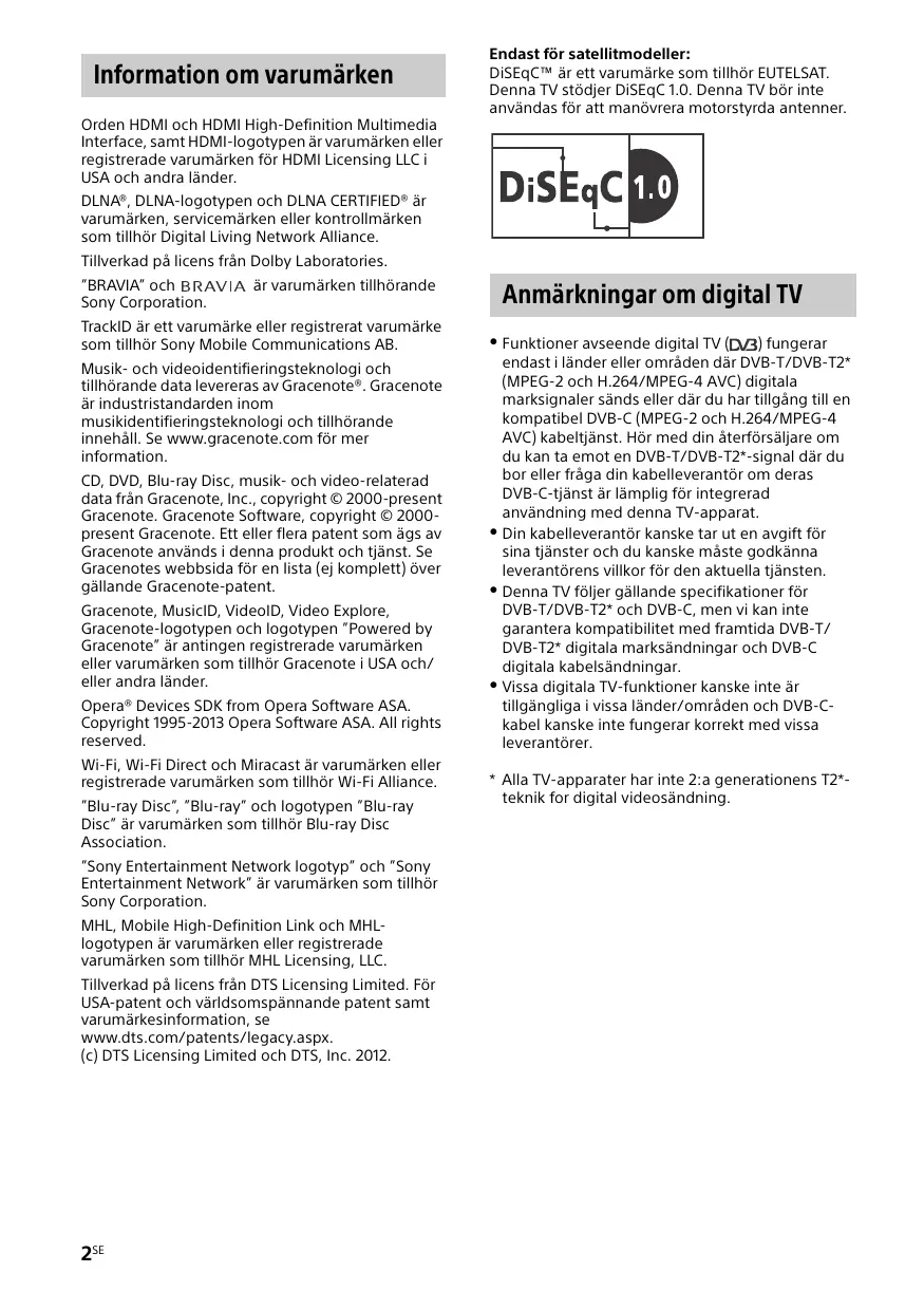 - Il consumo specificato in standby viene raggiunto una volta ultimati i processi interni necessari del televisore. Le immagini e le illustrazioni utilizzate nella Guida introduttiva, nella Guida di riferimento e nelle Informazioni sulla sicurezza servono esclusivamente come riferimento e potrebbero differire dal prodotto effettivo. La “x” che appare sul nome del modello corrisponde a un carattere numerico correlato al design, al colore o al sistema TV. Non estrarre la scheda finta dall’alloggiamento CAM (Conditional Access Module, modulo di accesso condizionale) del televisore quando non è necessario inserire una vera smart card. La disponibilità degli accessori opzionali dipende dai paesi/dalle regioni/dai modelli di televisore/ dalle scorte. Design e caratteristiche tecniche sono soggetti a modifiche senza preavviso. 5IT 6IT BKE BKE/BLE Board BKT/BLT Board Diagrammi a blocchi Information om varumärken Endast för satellitmodeller: DiSEqC™ är ett varumärke som tillhör EUTELSAT. Denna TV stödjer DiSEqC 1.0. Denna TV bör inte användas för att manövrera motorstyrda antenner. Orden HDMI och HDMI High-Definition Multimedia Interface, samt HDMI-logotypen är varumärken eller registrerade varumärken för HDMI Licensing LLC i USA och andra länder. DLNA®, DLNA-logotypen och DLNA CERTIFIED® är varumärken, servicemärken eller kontrollmärken som tillhör Digital Living Network Alliance. Tillverkad på licens från Dolby Laboratories. ”BRAVIA” och Sony Corporation. är varumärken tillhörande TrackID är ett varumärke eller registrerat varumärke som tillhör Sony Mobile Communications AB. Musik- och videoidentifieringsteknologi och tillhörande data levereras av Gracenote®. Gracenote är industristandarden inom musikidentifieringsteknologi och tillhörande innehåll. Se www.gracenote.com för mer information. CD, DVD, Blu-ray Disc, musik- och video-relaterad data från Gracenote, Inc., copyright © 2000-present Gracenote. Gracenote Software, copyright © 2000present Gracenote. Ett eller flera patent som ägs av Gracenote används i denna produkt och tjänst. Se Gracenotes webbsida för en lista (ej komplett) över gällande Gracenote-patent. Gracenote, MusicID, VideoID, Video Explore, Gracenote-logotypen och logotypen ”Powered by Gracenote” är antingen registrerade varumärken eller varumärken som tillhör Gracenote i USA och/ eller andra länder. Opera® Devices SDK from Opera Software ASA. Copyright 1995-2013 Opera Software ASA. All rights reserved. Wi-Fi, Wi-Fi Direct och Miracast är varumärken eller registrerade varumärken som tillhör Wi-Fi Alliance. ”Blu-ray Disc”, ”Blu-ray” och logotypen ”Blu-ray Disc” är varumärken som tillhör Blu-ray Disc Association. ”Sony Entertainment Network logotyp” och ”Sony Entertainment Network” är varumärken som tillhör Sony Corporation. MHL, Mobile High-Definition Link och MHLlogotypen är varumärken eller registrerade varumärken som tillhör MHL Licensing, LLC. Tillverkad på licens från DTS Licensing Limited. För USA-patent och världsomspännande patent samt varumärkesinformation, se www.dts.com/patents/legacy.aspx. (c) DTS Licensing Limited och DTS, Inc. 2012. 2SE Anmärkningar om digital TV Funktioner avseende digital TV ( ) fungerar endast i länder eller områden där DVB-T/DVB-T2* (MPEG-2 och H.264/MPEG-4 AVC) digitala marksignaler sänds eller där du har tillgång till en kompatibel DVB-C (MPEG-2 och H.264/MPEG-4 AVC) kabeltjänst. Hör med din återförsäljare om du kan ta emot en DVB-T/DVB-T2*-signal där du bor eller fråga din kabelleverantör om deras DVB-C-tjänst är lämplig för integrerad användning med denna TV-apparat. Din kabelleverantör kanske tar ut en avgift för sina tjänster och du kanske måste godkänna leverantörens villkor för den aktuella tjänsten. Denna TV följer gällande specifikationer för DVB-T/DVB-T2* och DVB-C, men vi kan inte garantera kompatibilitet med framtida DVB-T/ DVB-T2* digitala marksändningar och DVB-C digitala kabelsändningar. Vissa digitala TV-funktioner kanske inte är tillgängliga i vissa länder/områden och DVB-Ckabel kanske inte fungerar korrekt med vissa leverantörer.