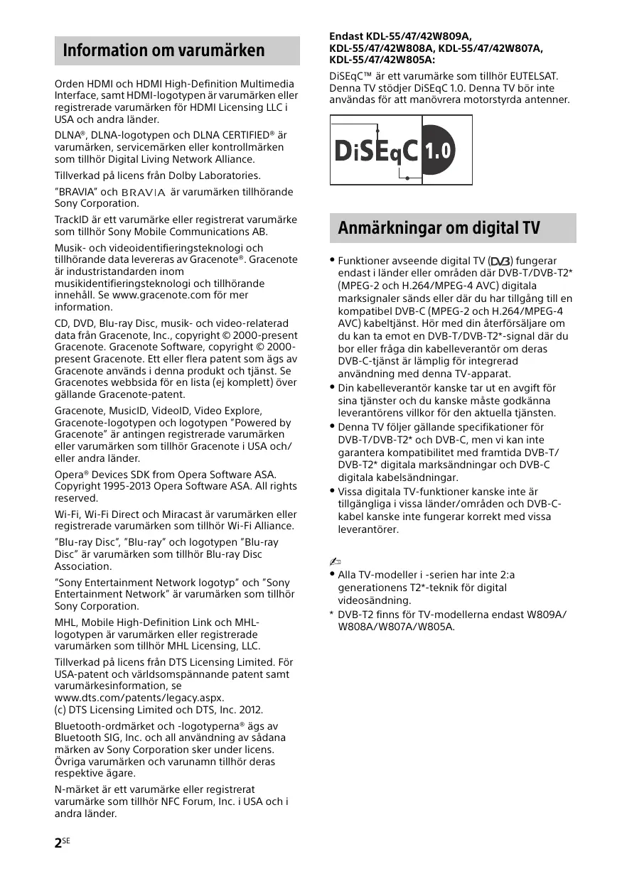 - Il consumo specificato in standby viene raggiunto una volta ultimati i processi interni necessari del televisore. 5IT Diagrammi a blocchi 6IT Information om varumärken Orden HDMI och HDMI High-Definition Multimedia Interface, samt HDMI-logotypen är varumärken eller registrerade varumärken för HDMI Licensing LLC i USA och andra länder. Endast KDL-55/47/42W809A, KDL-55/47/42W808A, KDL-55/47/42W807A, KDL-55/47/42W805A: DiSEqC™ är ett varumärke som tillhör EUTELSAT. Denna TV stödjer DiSEqC 1.0. Denna TV bör inte användas för att manövrera motorstyrda antenner. DLNA®, DLNA-logotypen och DLNA CERTIFIED® är varumärken, servicemärken eller kontrollmärken som tillhör Digital Living Network Alliance. Tillverkad på licens från Dolby Laboratories. ”BRAVIA” och Sony Corporation. är varumärken tillhörande TrackID är ett varumärke eller registrerat varumärke som tillhör Sony Mobile Communications AB. Musik- och videoidentifieringsteknologi och tillhörande data levereras av Gracenote®. Gracenote är industristandarden inom musikidentifieringsteknologi och tillhörande innehåll. Se www.gracenote.com för mer information. CD, DVD, Blu-ray Disc, musik- och video-relaterad data från Gracenote, Inc., copyright © 2000-present Gracenote. Gracenote Software, copyright © 2000present Gracenote. Ett eller flera patent som ägs av Gracenote används i denna produkt och tjänst. Se Gracenotes webbsida för en lista (ej komplett) över gällande Gracenote-patent. Gracenote, MusicID, VideoID, Video Explore, Gracenote-logotypen och logotypen ”Powered by Gracenote” är antingen registrerade varumärken eller varumärken som tillhör Gracenote i USA och/ eller andra länder. Opera® Devices SDK from Opera Software ASA. Copyright 1995-2013 Opera Software ASA. All rights reserved. Wi-Fi, Wi-Fi Direct och Miracast är varumärken eller registrerade varumärken som tillhör Wi-Fi Alliance. ”Blu-ray Disc”, ”Blu-ray” och logotypen ”Blu-ray Disc” är varumärken som tillhör Blu-ray Disc Association. ”Sony Entertainment Network logotyp” och ”Sony Entertainment Network” är varumärken som tillhör Sony Corporation. MHL, Mobile High-Definition Link och MHLlogotypen är varumärken eller registrerade varumärken som tillhör MHL Licensing, LLC. Tillverkad på licens från DTS Licensing Limited. För USA-patent och världsomspännande patent samt varumärkesinformation, se www.dts.com/patents/legacy.aspx. (c) DTS Licensing Limited och DTS, Inc. 2012. Bluetooth-ordmärket och -logotyperna® ägs av Bluetooth SIG, Inc. och all användning av sådana märken av Sony Corporation sker under licens. Övriga varumärken och varunamn tillhör deras respektive ägare. N-märket är ett varumärke eller registrerat varumärke som tillhör NFC Forum, Inc. i USA och i andra länder. 2SE Anmärkningar om digital TV Funktioner avseende digital TV ( ) fungerar endast i länder eller områden där DVB-T/DVB-T2* (MPEG-2 och H.264/MPEG-4 AVC) digitala marksignaler sänds eller där du har tillgång till en kompatibel DVB-C (MPEG-2 och H.264/MPEG-4 AVC) kabeltjänst. Hör med din återförsäljare om du kan ta emot en DVB-T/DVB-T2*-signal där du bor eller fråga din kabelleverantör om deras DVB-C-tjänst är lämplig för integrerad användning med denna TV-apparat. Din kabelleverantör kanske tar ut en avgift för sina tjänster och du kanske måste godkänna leverantörens villkor för den aktuella tjänsten. Denna TV följer gällande specifikationer för DVB-T/DVB-T2* och DVB-C, men vi kan inte garantera kompatibilitet med framtida DVB-T/ DVB-T2* digitala marksändningar och DVB-C digitala kabelsändningar. Vissa digitala TV-funktioner kanske inte är tillgängliga i vissa länder/områden och DVB-Ckabel kanske inte fungerar korrekt med vissa leverantörer. Alla TV-modeller i -serien har inte 2:a generationens T2*-teknik för digital videosändning.