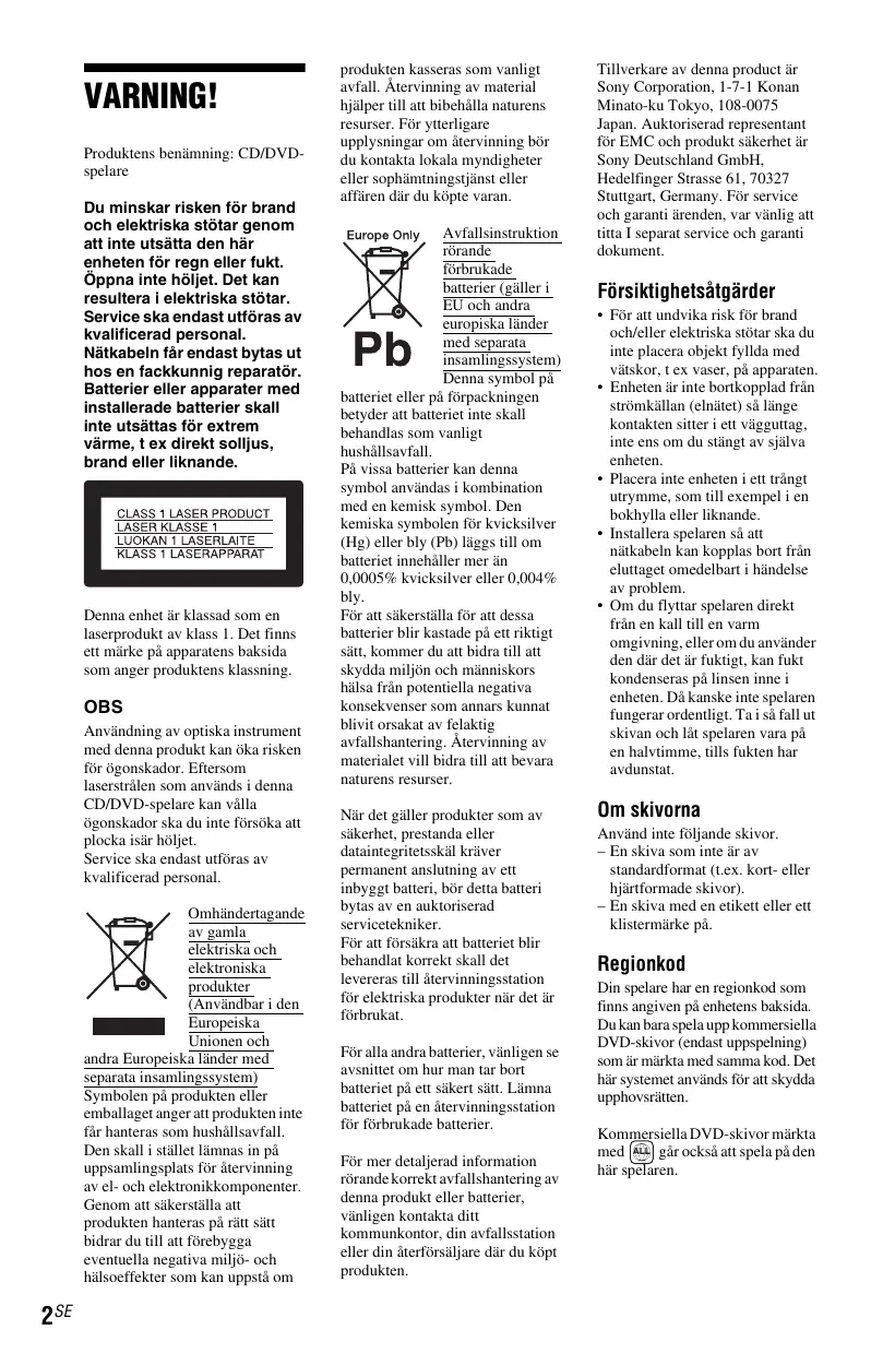 10SE VAROITUS Tuotteen nimi: CD/DVD-soitin Tulipalo- ja sähköiskuvaaran välttämiseksi älä jätä laitetta alttiiksi sateelle tai kosteudelle. Älä avaa laitteen koteloa, jotta et altistu sähköiskulle. Laitteen saa huoltaa vain ammattitaitoinen huoltoliike. Verkkojohdon saa vaihtaa vain ammattitaitoinen huoltoliike. Älä säilytä paristoja tai niitä sisältäviä laitteita auringonvalossa tai avotulen tai muun lämmönlähteen lähettyvillä.