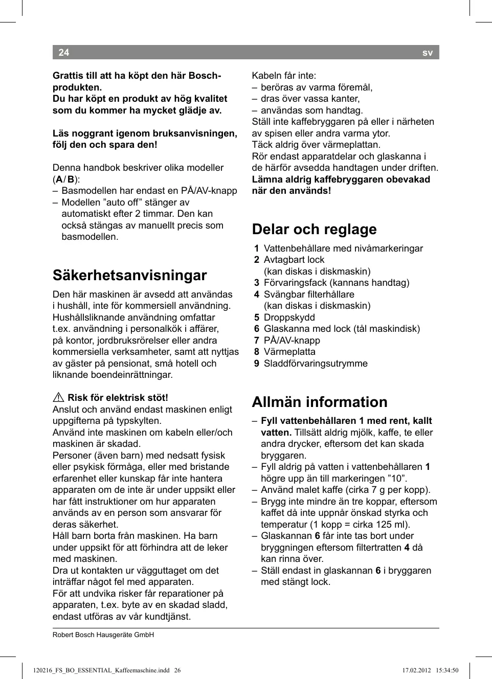 Den här apparaten är märkt enligt europeiskt direktiv 2002/96/EG om avfall som utgörs av eller innehåller elektriska och elektroniska produkter (waste electrical and electronic equipment – WEEE). I direktivet inns anvisningar för återtagning och återvinning av förbrukade apparater inom EG. Kontakta din fackhandel om du vill ha ytterligare information. Konsumentbestämmelser I Sverige gäller av EHL antagna konsumentbestämmelser. Den fullständiga texten inns hos din handlare. Spar kvittot. Rätt till ändringar förbehålls. Robert Bosch Hausgeräte GmbH 120216_FS_BO_ESSENTIAL_Kaffeemaschine.indd 28