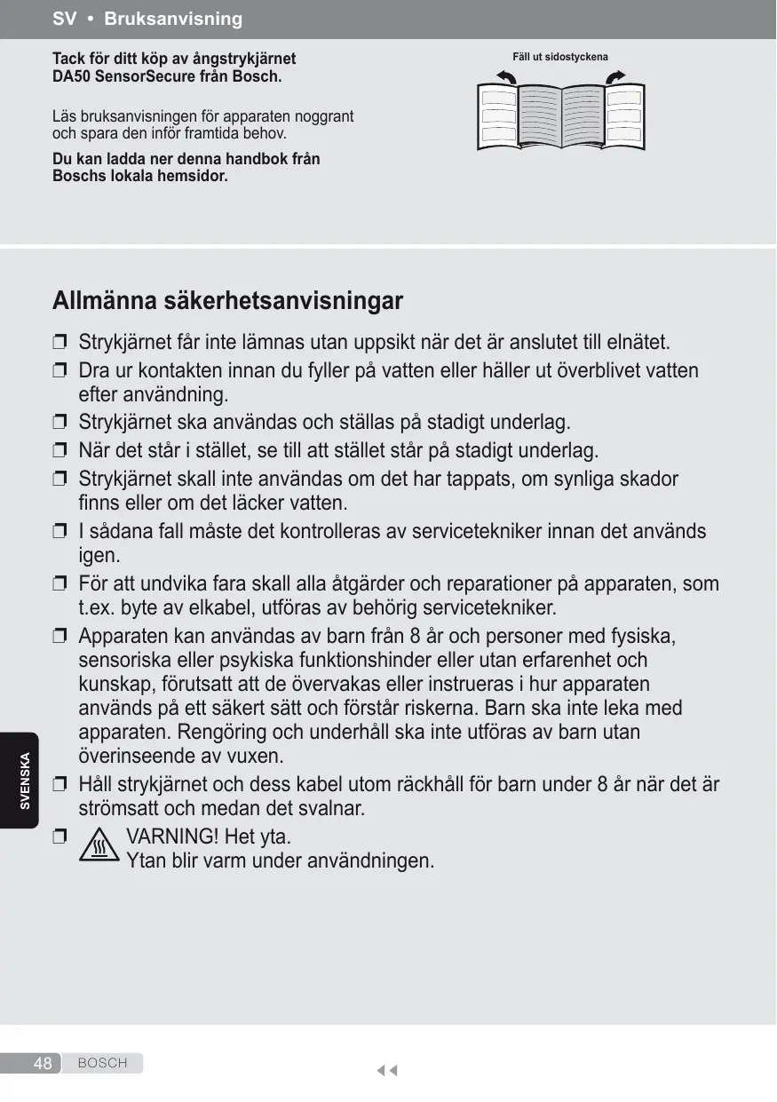 SV • Bruksanvisning Tack för ditt köp av ångstrykjärnet DA50 SensorSecure från Bosch.