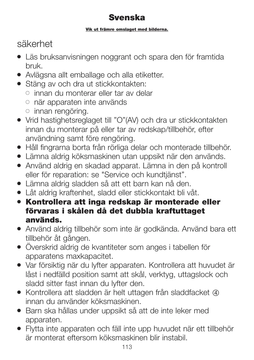 Läs bruksanvisningen noggrant och spara den för framtida bruk. Avlägsna allt emballage och alla etiketter. Stäng av och dra ut stickkontakten: l innan du monterar eller tar av delar l när apparaten inte används l innan rengöring. Vrid hastighetsreglaget till ”O”(AV) och dra ur stickkontakten innan du monterar på eller tar av redskap/tillbehör, efter användning samt före rengöring. Håll fingrarna borta från rörliga delar och monterade tillbehör. Lämna aldrig köksmaskinen utan uppsikt när den används. Använd aldrig en skadad apparat. Lämna in den på kontroll eller för reparation: se "Service och kundtjänst”. Lämna aldrig sladden så att ett barn kan nå den. Låt aldrig kraftenhet, sladd eller stickkontakt bli våt. Kontrollera att inga redskap är monterade eller förvaras i skålen då det dubbla kraftuttaget används. Använd aldrig tillbehör som inte är godkända. Använd bara ett tillbehör åt gången. Överskrid aldrig de kvantiteter som anges i tabellen för apparatens maxkapacitet. Var försiktig när du lyfter apparaten. Kontrollera att huvudet är låst i nedfälld position samt att skål, verktyg, uttagslock och sladd sitter fast innan du lyfter den. Kontrollera att sladden är helt uttagen från sladdfacket 4 innan du använder köksmaskinen. Barn ska hållas under uppsikt så att de inte leker med apparaten. Flytta inte apparaten och fäll inte upp huvudet när ett tillbehör är monterat eftersom köksmaskinen blir instabil.