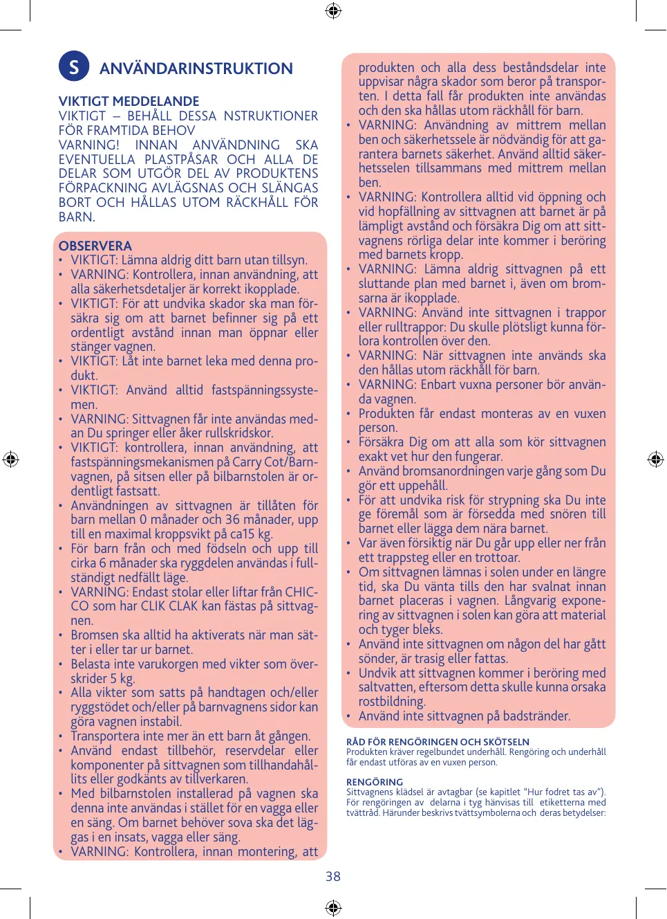 Les opérations de nettoyage et d’entretien doivent être réalisées uniquement par un adulte. NETTOYAGE La poussette est déhoussable (consulter le chapitre « HOUSSE AMOVIBLE ») Pour nettoyer les parties en tissu, consulter les étiquettes de lavage. Nous indiquons ci-dessous les symboles de lavage et leur signification: