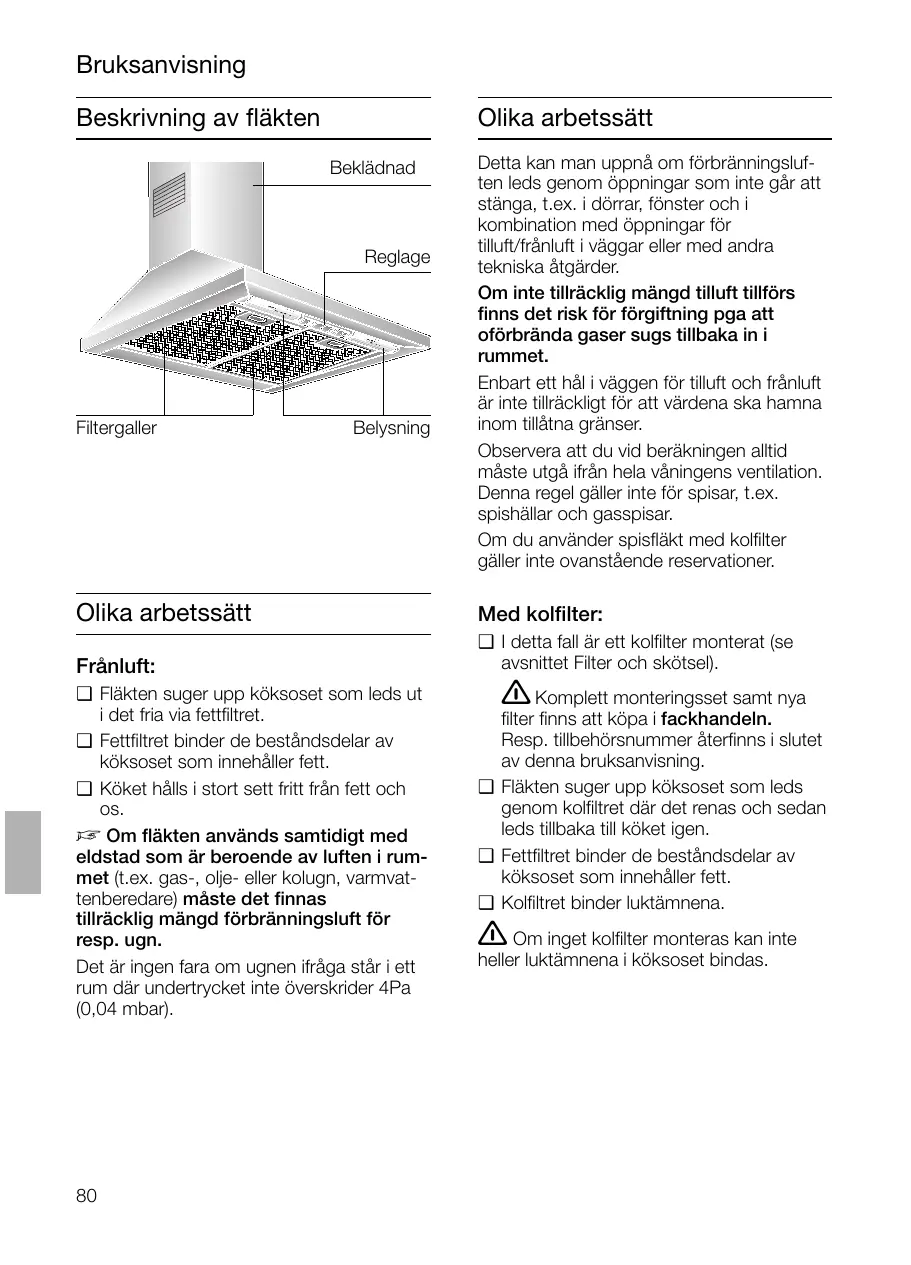 Kolfilter: Kolfiltret binder luktämnena. Obs! Allt eftersom filtret fylls med fetthaltiga ämnen ökar risken för antändning. Dessutom påverkas fläktens sugeffekt negativt. Viktigt! Genom att i god tid byta till nytt kolfilter förebyggs risken för brand i samband med fritering resp. stekning.
