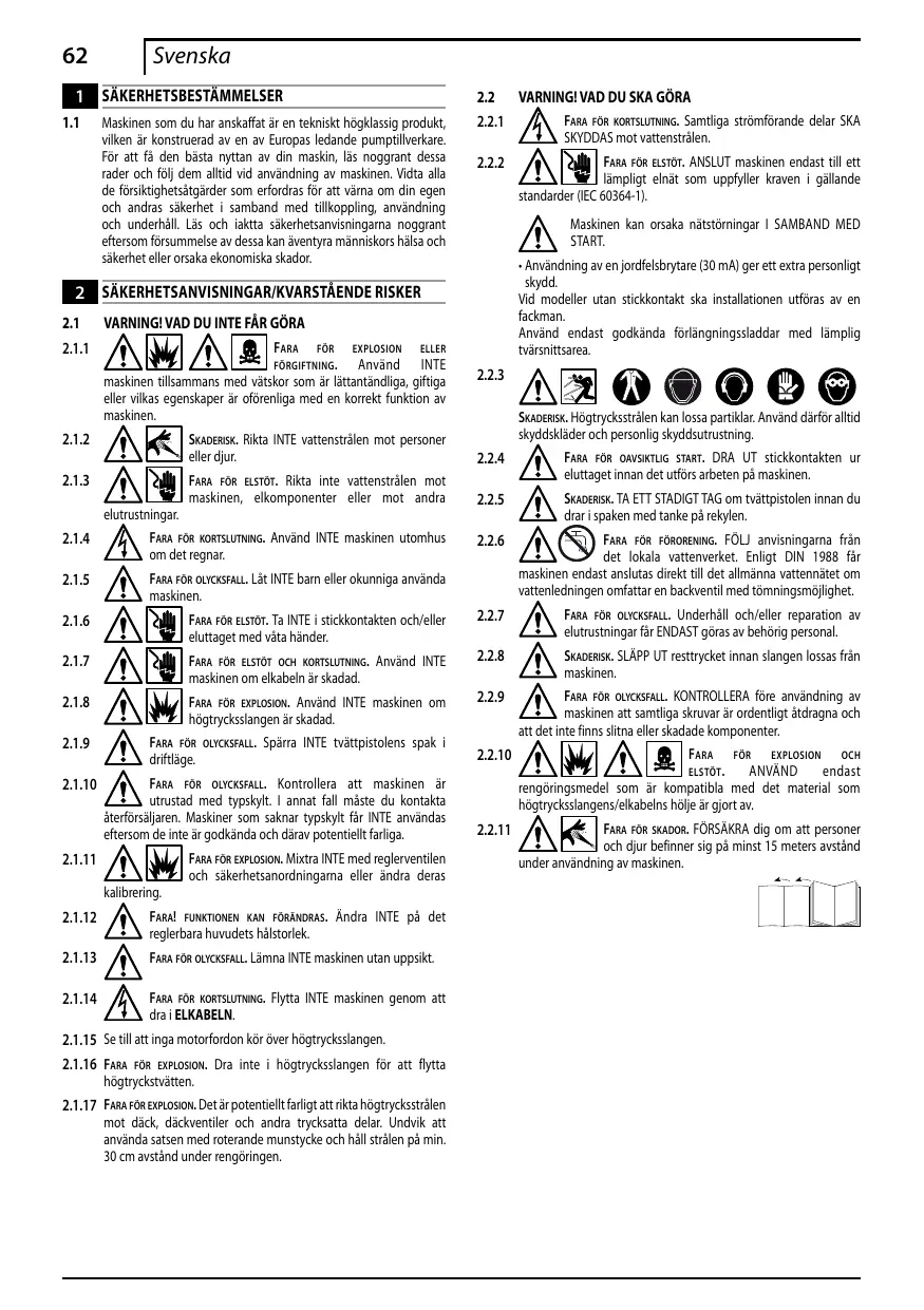 ANVÄND endast rengöringsmedel som är kompatibla med det material som högtrycksslangens/elkabelns hölje är gjort av. Fara för skador. FÖRSÄKRA dig om att personer och djur befinner sig på minst 15 meters avstånd under användning av maskinen.