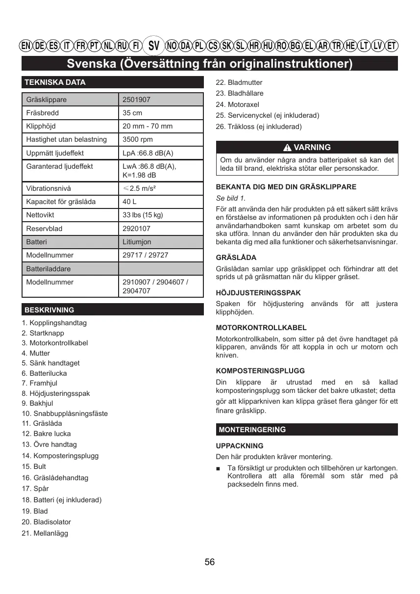 BRUKSANVISNING G40LM35 - G40LM35K2 - G40LM41 - G40LM45K4 - GD40LM45 - GD40LM46SP GREENWORKS