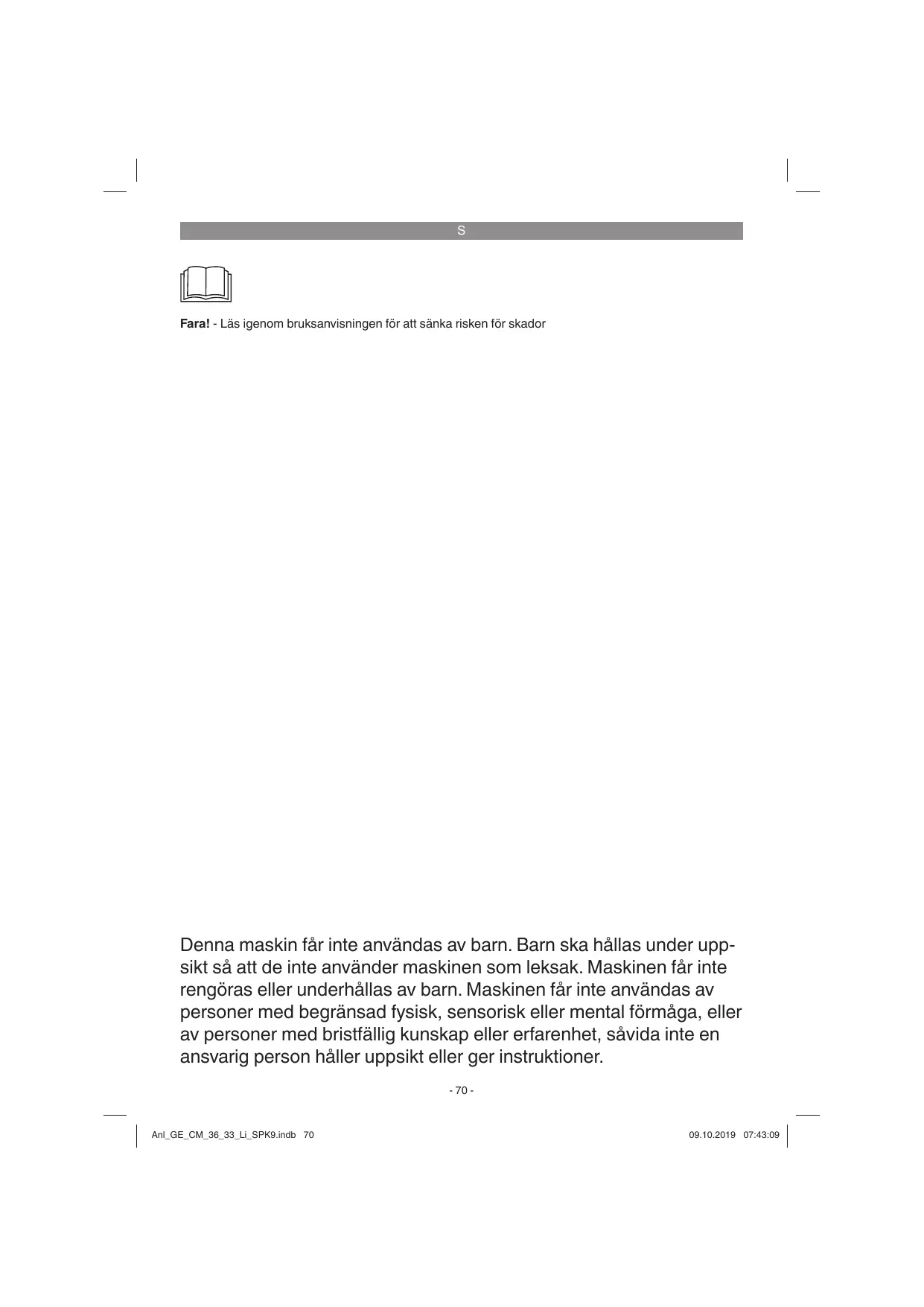 Denna maskin får inte användas av barn. Barn ska hållas under uppsikt så att de inte använder maskinen som leksak. Maskinen får inte rengöras eller underhållas av barn. Maskinen får inte användas av personer med begränsad fysisk, sensorisk eller mental förmåga, eller av personer med bristfällig kunskap eller erfarenhet, såvida inte en ansvarig person håller uppsikt eller ger instruktioner. - 70 -