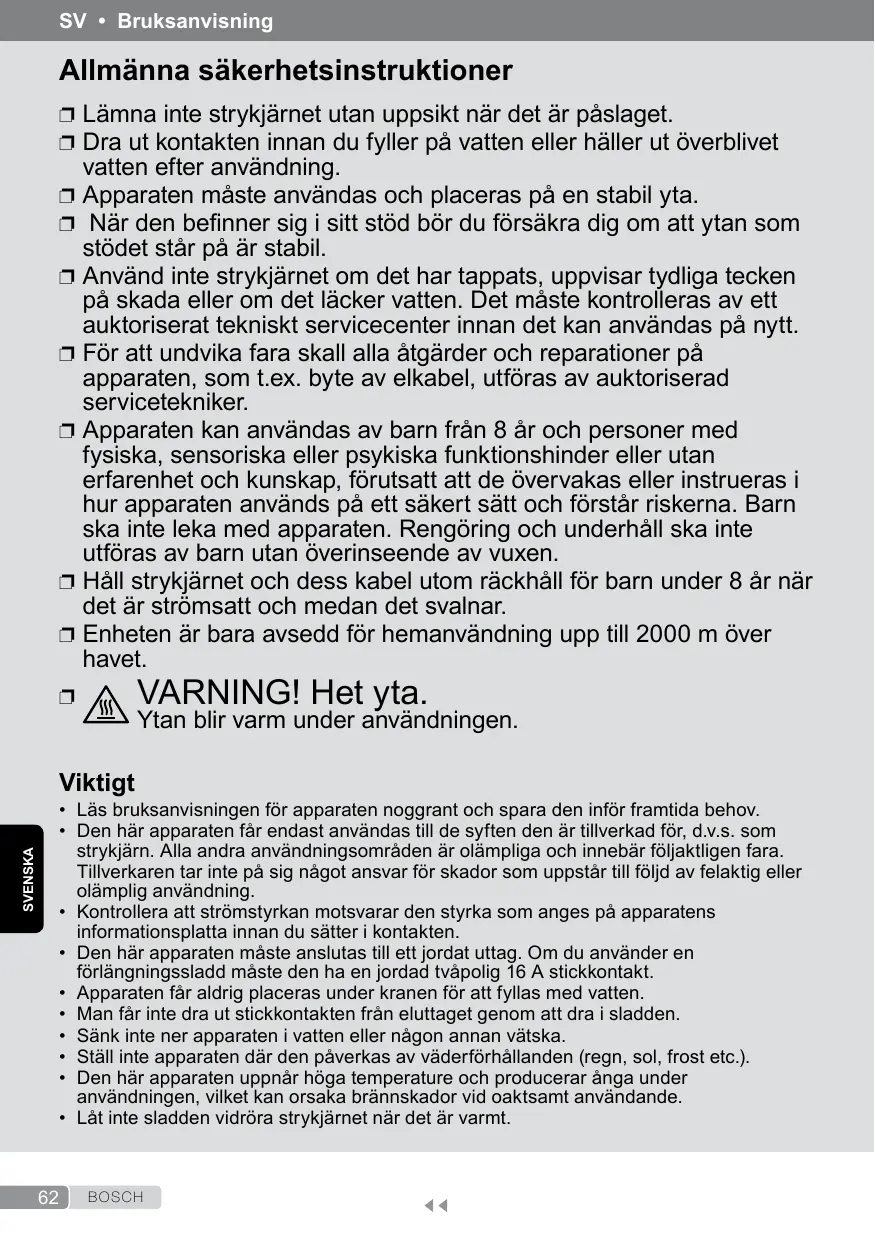 - Den här apparaten får endast användas till de syften den är tillverkad för, d.v.s. som strykjärn. Alla andra användningsområden är olämpliga och innebär följaktligen fara. Tillverkaren tar inte på sig något ansvar för skador som uppstår till följd av felaktig eller olämplig användning.