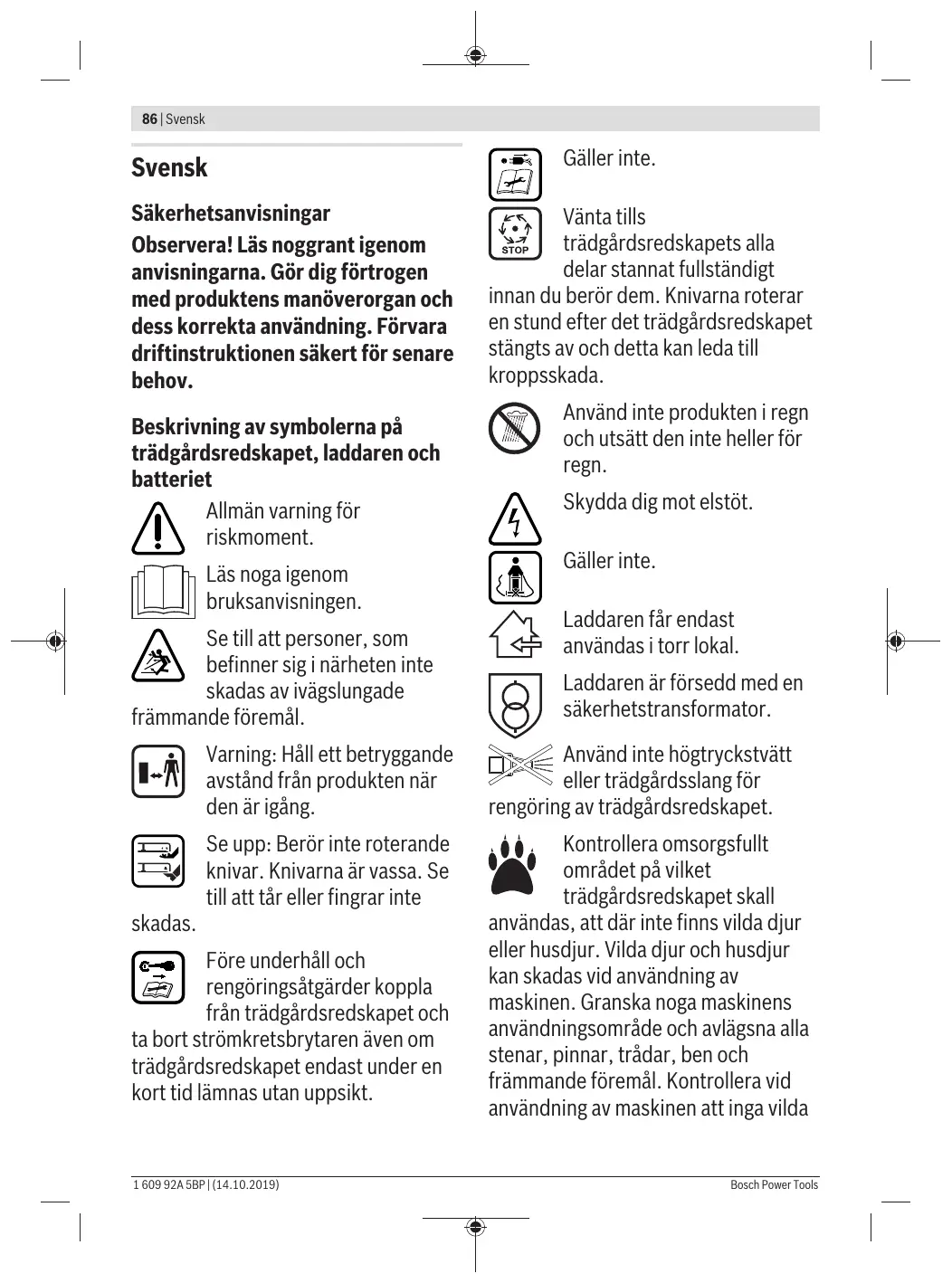 Gäller inte. Vänta tills trädgårdsredskapets alla delar stannat fullständigt innan du berör dem. Knivarna roterar en stund efter det trädgårdsredskapet stängts av och detta kan leda till kroppsskada. Använd inte produkten i regn och utsätt den inte heller för regn. Skydda dig mot elstöt. Gäller inte. Laddaren får endast användas i torr lokal. Laddaren är försedd med en säkerhetstransformator.
