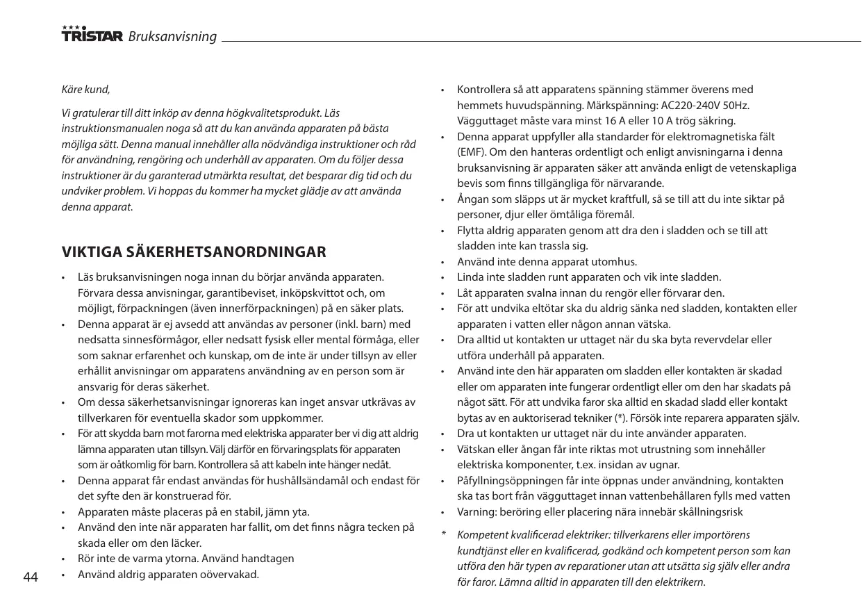 Tristar kan inte hällas ansvariga for materiell skada eller personskada som orsakas av felaktig användning ull av att sakerhetsanvisingarna inte foljts.