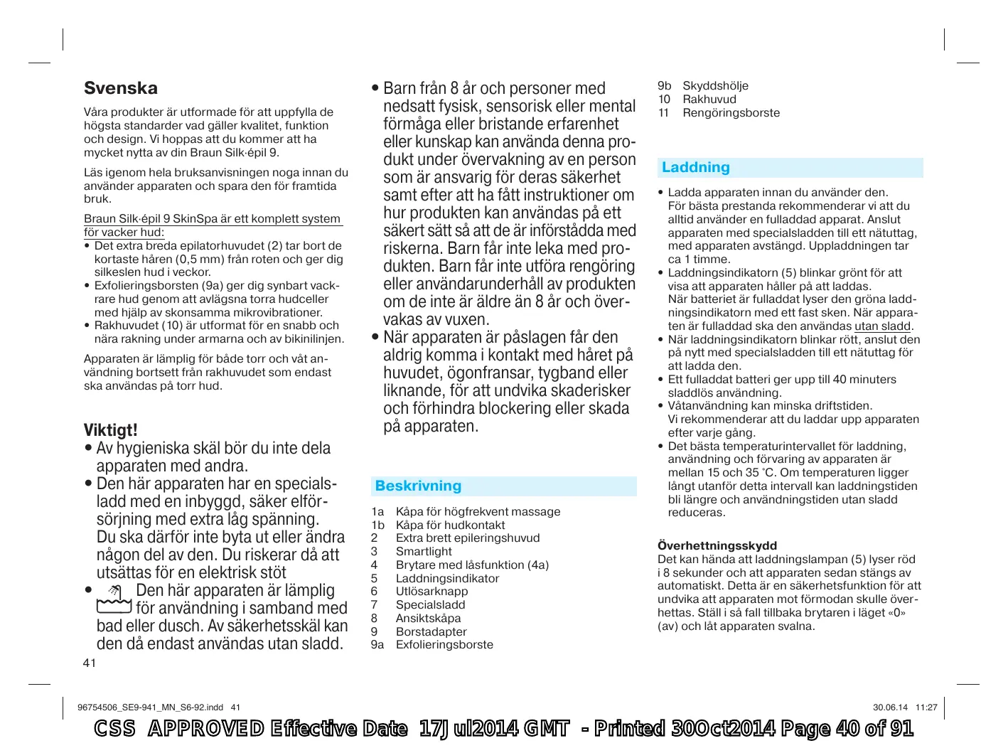 CSS APPROVED Effective Date 17Jul2014 GMT - Printed 30Oct2014 Page 39 of 91 Svenska Våra produkter är utformade för att uppfylla de högsta standarder vad gäller kvalitet, funktion och design. Vi hoppas att du kommer att ha mycket nytta av din Braun Silk·épil 9. Läs igenom hela bruksanvisningen noga innan du använder apparaten och spara den för framtida bruk. Braun Silk·épil 9 SkinSpa är ett komplett system för vacker hud: