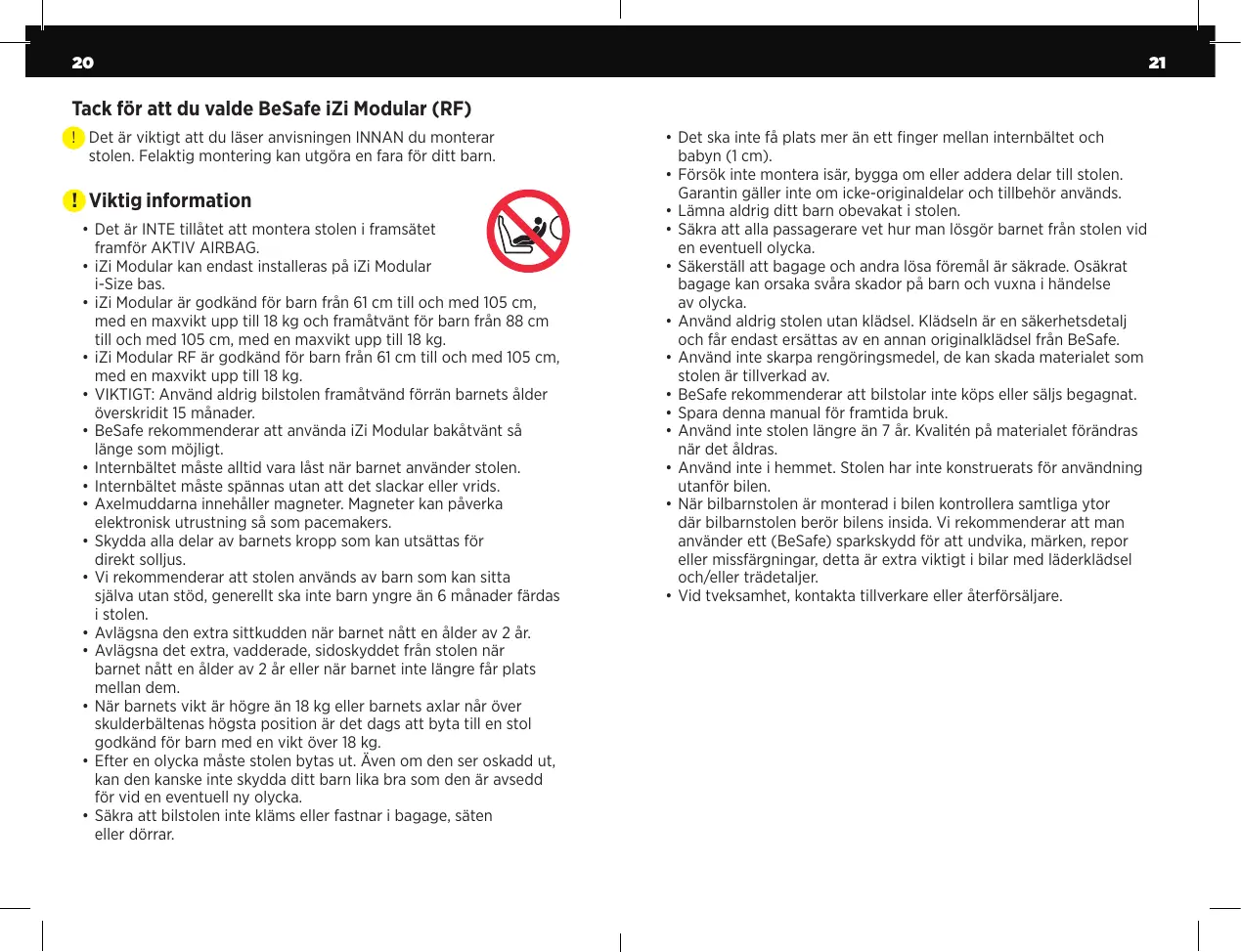 • Il est INTERDIT d’installer le siège sur un siège avant AVEC UN AIRBAG ACTIVÉ. • iZi Modular ne peut être installé que sur la base iZi Modular i-Size. • iZi Modular est approuvé Dos Route pour des enfants mesurant de 61 à 105 cm et pesant au maximum 18 kg et Face Route pour des enfants mesurant de 88 à 105 cm et pesant au maximum 18kg. • iZi Modular RF( Dos Route) est approuvé pour des enfants mesurant de 61 à 105 cm, pesant au maximum 18kg. • Important:ne pas utiliser Face Route avant les 15 mois de l’enfant. • BeSafe recommande d’utliser le siège Dos Route aussi longtemps que possible. • Les sangles du harnais doivent toujours être attachées lorsque l’enfant est dans le siège. • Les sangles du harnais doivent être bien serrées sans être tordues. • Les protections d’épaule contiennent des aimants. Les aimants peuvent avoir une influence sur les équipements électroniques tels que les pacemakers. • Protéger toutes les parties de l’enfant exposées au soleil. • Nous vous conseillons d’utiliser ce siège uniquement pour des enfants qui peuvent se tenir assis, soit pas avant l’âge de 6 mois. • Retirer le coussin réducteur lorsque l’enfant a passé 2 ans. • Retirer les supports latéraux supplémentaires lorsque l’enfant a passé 2 ans ou plus tôt si l’enfant ne tient plus entre ces supports. • Lorsque l’enfant pèse plus de 18 kg ou lorsque sa hauteur d’épaule dépasse la position la plus élevée des bretelles du harnais, il convient d’utiliser un siège du groupe 2/3. • Le siège doit être remplacé après un accident. Bien qu’il puisse avoir l’air intact, en cas de nouvel accident, le siège pourrait ne pas être en mesure de protéger votre enfant aussi bien qu’il le devrait. • Evitez de comprimer avec ou de faire peser sur le siège-auto des bagages ou autres objets encombrants lors du réglage des sièges de la voiture ou de la fermeture des portières.