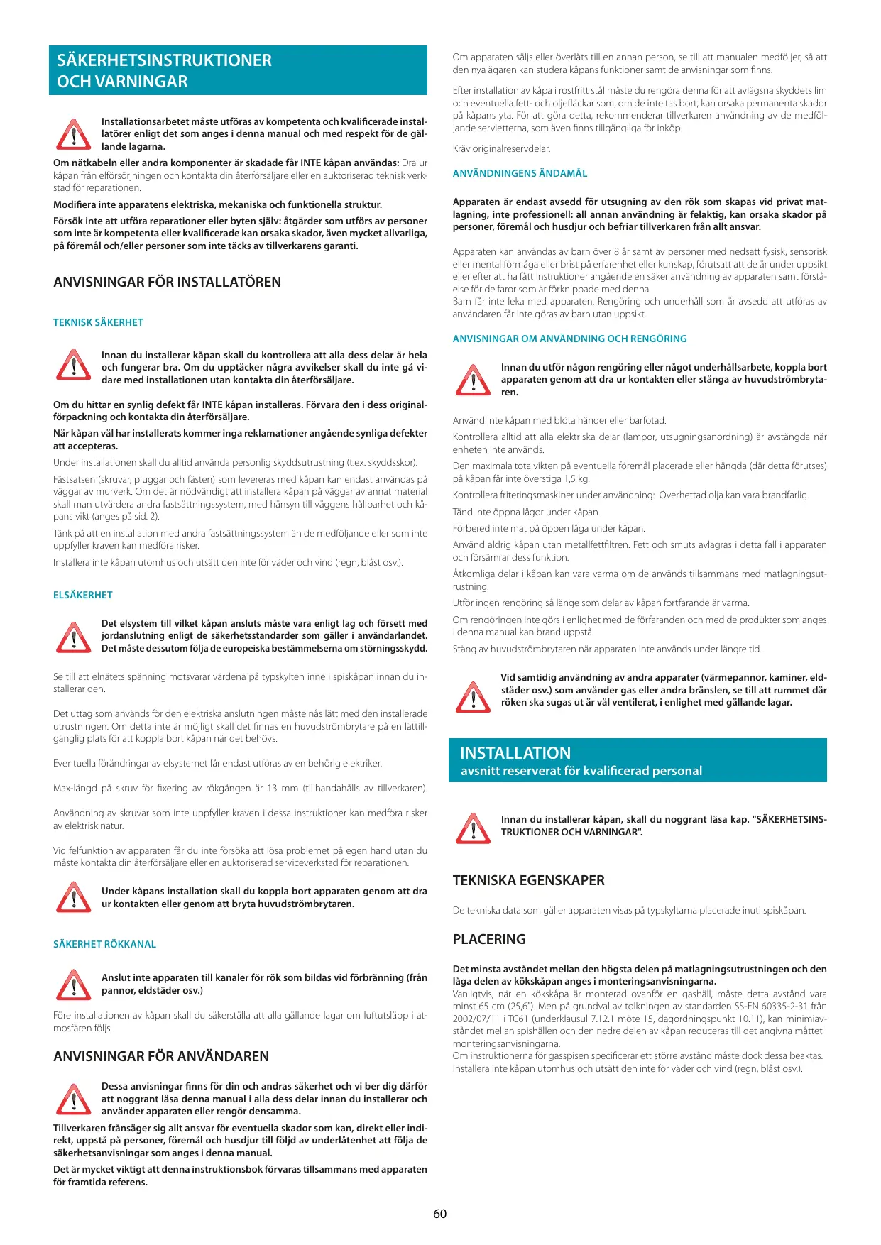 ANVISNINGAR OM ANVÄNDNING OCH RENGÖRING Innan du installerar kåpan skall du kontrollera att alla dess delar är hela och fungerar bra. Om du upptäcker några avvikelser skall du inte gå vidare med installationen utan kontakta din återförsäljare. Innan du utför någon rengöring eller något underhållsarbete, koppla bort apparaten genom att dra ur kontakten eller stänga av huvudströmbrytaren. Om du hittar en synlig defekt får INTE kåpan installeras. Förvara den i dess originalförpackning och kontakta din återförsäljare. Använd inte kåpan med blöta händer eller barfotad. När kåpan väl har installerats kommer inga reklamationer angående synliga defekter att accepteras. Kontrollera alltid att alla elektriska delar (lampor, utsugningsanordning) är avstängda när enheten inte används. Under installationen skall du alltid använda personlig skyddsutrustning (t.ex. skyddsskor). Den maximala totalvikten på eventuella föremål placerade eller hängda (där detta förutses) på kåpan får inte överstiga 1,5 kg. Fästsatsen (skruvar, pluggar och fästen) som levereras med kåpan kan endast användas på väggar av murverk. Om det är nödvändigt att installera kåpan på väggar av annat material skall man utvärdera andra fastsättningssystem, med hänsyn till väggens hållbarhet och kåpans vikt (anges på sid. 2). Kontrollera friteringsmaskiner under användning: Överhettad olja kan vara brandfarlig. Tänd inte öppna lågor under kåpan. Förbered inte mat på öppen låga under kåpan. Tänk på att en installation med andra fastsättningssystem än de medföljande eller som inte uppfyller kraven kan medföra risker. Använd aldrig kåpan utan metallfettfiltren. Fett och smuts avlagras i detta fall i apparaten och försämrar dess funktion. Installera inte kåpan utomhus och utsätt den inte för väder och vind (regn, blåst osv.). Åtkomliga delar i kåpan kan vara varma om de används tillsammans med matlagningsutrustning. ELSÄKERHET Utför ingen rengöring så länge som delar av kåpan fortfarande är varma. Det elsystem till vilket kåpan ansluts måste vara enligt lag och försett med jordanslutning enligt de säkerhetsstandarder som gäller i användarlandet. Det måste dessutom följa de europeiska bestämmelserna om störningsskydd. Om rengöringen inte görs i enlighet med de förfaranden och med de produkter som anges i denna manual kan brand uppstå. Se till att elnätets spänning motsvarar värdena på typskylten inne i spiskåpan innan du installerar den. Vid samtidig användning av andra apparater (värmepannor, kaminer, eldstäder osv.) som använder gas eller andra bränslen, se till att rummet där röken ska sugas ut är väl ventilerat, i enlighet med gällande lagar. Stäng av huvudströmbrytaren när apparaten inte används under längre tid. Det uttag som används för den elektriska anslutningen måste nås lätt med den installerade utrustningen. Om detta inte är möjligt skall det finnas en huvudströmbrytare på en lättillgänglig plats för att koppla bort kåpan när det behövs. INSTALLATION Eventuella förändringar av elsystemet får endast utföras av en behörig elektriker. avsnitt reserverat för kvalificerad personal Max-längd på skruv för fixering av rökgången är 13 mm (tillhandahålls av tillverkaren). Användning av skruvar som inte uppfyller kraven i dessa instruktioner kan medföra risker av elektrisk natur. Innan du installerar kåpan, skall du noggrant läsa kap. "SÄKERHETSINSTRUKTIONER OCH VARNINGAR". Vid felfunktion av apparaten får du inte försöka att lösa problemet på egen hand utan du måste kontakta din återförsäljare eller en auktoriserad serviceverkstad för reparationen. TEKNISKA EGENSKAPER Under kåpans installation skall du koppla bort apparaten genom att dra ur kontakten eller genom att bryta huvudströmbrytaren. De tekniska data som gäller apparaten visas på typskyltarna placerade inuti spiskåpan. PLACERING