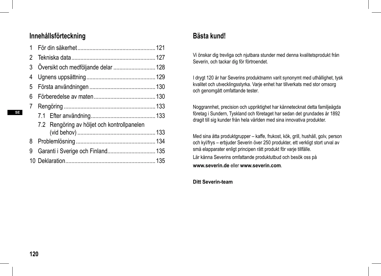 • 10 Deklaration Bästa kund! Vi önskar dig trevliga och njutbara stunder med denna kvalitetsprodukt från Severin, och tackar dig för förtroendet. I drygt 120 år har Severins produktnamn varit synonymt med uthållighet, tysk kvalitet och utvecklingsstyrka. Varje enhet har tillverkats med stor omsorg och genomgått omfattande tester. Noggrannhet, precision och uppriktighet har kännetecknat detta familjeägda företag i Sundern, Tyskland och företaget har sedan det grundades år 1892 dragit till sig kunder från hela världen med sina innovativa produkter. Med sina åtta produktgrupper – kaffe, frukost, kök, grill, hushåll, golv, person och kyl/frys – erbjuder Severin över 250 produkter, ett verkligt stort urval av små elapparater enligt principen rätt produkt för varje tillfälle. Lär känna Severins omfattande produktutbud och besök oss på www.severin.de eller www.severin.com. Ditt Severin-team p. 135