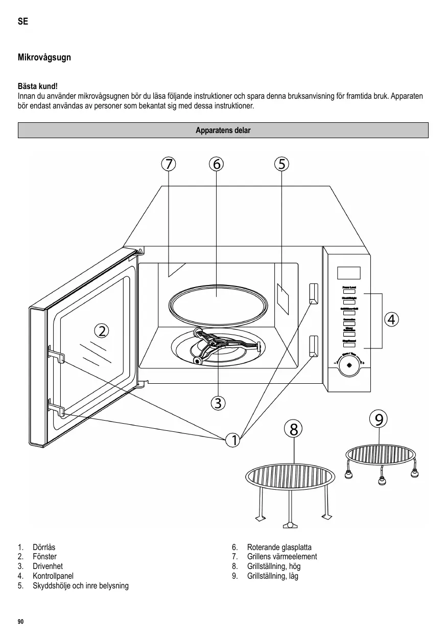 Mikrovågsugn Bästa kund! Innan du använder mikrovågsugnen bör du läsa följande instruktioner och spara denna bruksanvisning för framtida bruk. Apparaten bör endast användas av personer som bekantat sig med dessa instruktioner. Apparatens delar