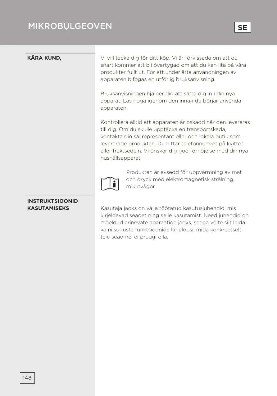 Vi vill tacka dig för ditt köp. Vi är förvissade om att du snart kommer att bli övertygad om att du kan lita på våra produkter fullt ut. För att underlätta användningen av apparaten bifogas en utförlig bruksanvisning. Bruksanvisningen hjälper dig att sätta dig in i din nya apparat. Läs noga igenom den innan du börjar använda apparaten. Kontrollera alltid att apparaten är oskadd när den levereras till dig. Om du skulle upptäcka en transportskada, kontakta din säljrepresentant eller den lokala butik som levererade produkten. Du hittar telefonnumret på kvittot eller fraktsedeln. Vi önskar dig god förnöjelse med din nya hushållsapparat. Produkten är avsedd för uppvärmning av mat och dryck med elektromagnetisk strålning, mikrovågor. INSTRUKTSIOONID KASUTAMISEKS