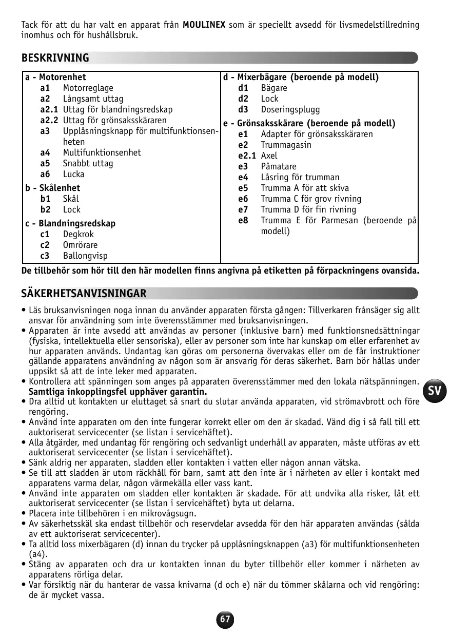 SÄKERHETSANVISNINGAR • Läs bruksanvisningen noga innan du använder apparaten första gången: Tillverkaren frånsäger sig allt ansvar för användning som inte överensstämmer med bruksanvisningen. • Apparaten är inte avsedd att användas av personer (inklusive barn) med funktionsnedsättningar (fysiska, intellektuella eller sensoriska), eller av personer som inte har kunskap om eller erfarenhet av hur apparaten används. Undantag kan göras om personerna övervakas eller om de får instruktioner gällande apparatens användning av någon som är ansvarig för deras säkerhet. Barn bör hållas under uppsikt så att de inte leker med apparaten. • Kontrollera att spänningen som anges på apparaten överensstämmer med den lokala nätspänningen. Samtliga inkopplingsfel upphäver garantin. • Dra alltid ut kontakten ur eluttaget så snart du slutar använda apparaten, vid strömavbrott och före rengöring. • Använd inte apparaten om den inte fungerar korrekt eller om den är skadad. Vänd dig i så fall till ett auktoriserat servicecenter (se listan i servicehäftet). • Alla åtgärder, med undantag för rengöring och sedvanligt underhåll av apparaten, måste utföras av ett auktoriserat servicecenter (se listan i servicehäftet). • Sänk aldrig ner apparaten, sladden eller kontakten i vatten eller någon annan vätska. • Se till att sladden är utom räckhåll för barn, samt att den inte är i närheten av eller i kontakt med apparatens varma delar, någon värmekälla eller vass kant. • Använd inte apparaten om sladden eller kontakten är skadade. För att undvika alla risker, låt ett auktoriserat servicecenter (se listan i servicehäftet) byta ut delarna. • Placera inte tillbehören i en mikrovågsugn. • Av säkerhetsskäl ska endast tillbehör och reservdelar avsedda för den här apparaten användas (sålda av ett auktoriserat servicecenter). • Ta alltid loss mixerbägaren (d) innan du trycker på upplåsningsknappen (a3) för multifunktionsenheten (a4). • Stäng av apparaten och dra ur kontakten innan du byter tillbehör eller kommer i närheten av apparatens rörliga delar. • Var försiktig när du hanterar de vassa knivarna (d och e) när du tömmer skålarna och vid rengöring: de är mycket vassa. 67