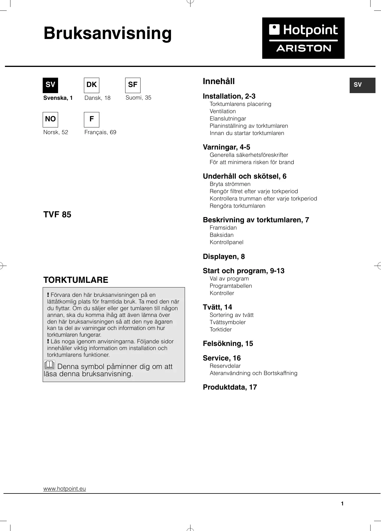 BRUKSANVISNING TCD87B6K HOTPOINT
