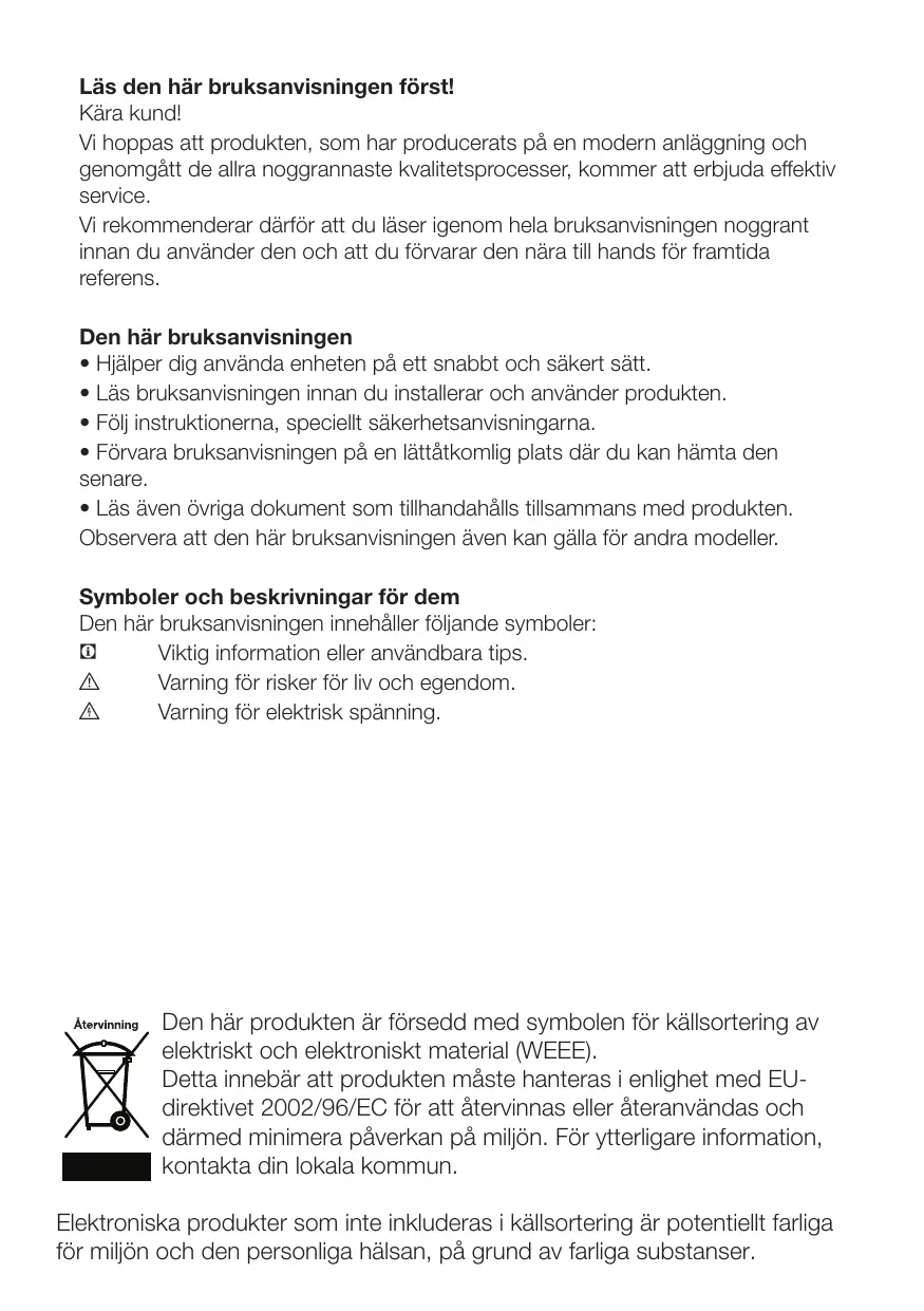 Den här produkten är försedd med symbolen för källsortering av elektriskt och elektroniskt material (WEEE). Detta innebär att produkten måste hanteras i enlighet med EUdirektivet 2002/96/EC för att återvinnas eller återanvändas och därmed minimera påverkan på miljön. För ytterligare information, kontakta din lokala kommun. Elektroniska produkter som inte inkluderas i källsortering är potentiellt farliga för miljön och den personliga hälsan, på grund av farliga substanser.