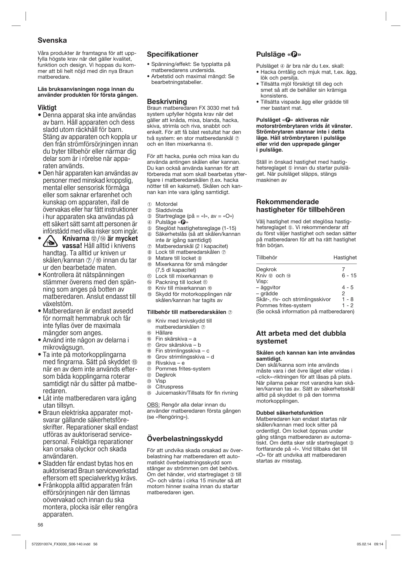 Motordel Sladdvinda Startreglage (på = «I», av = «O») Pulsläge «» Steglöst hastighetsreglage (1-15) Säkerhetslås (så att skålen/kannan inte är igång samtidigt) Matberedarskål (2 l kapacitet) Lock till matberedarskålen 7 Matare till locket 8 Mixerkanna för små mängder (7,5 dl kapacitet) Lock till mixerkannan j Packning till locket q Kniv till mixerkannan j Skydd för motorkopplingen när skålen/kannan har tagits av Tillbehör till matberedarskålen 7 n Kniv med knivskydd till matberedarskålen 7 o Hållare p Fin skärskiva – a q Grov skärskiva – b r Fin strimlingsskiva – c s Grov strimlingsskiva – d t Rivskiva – e u Pommes frites-system v Degkrok w Visp x Citruspress y Juicemaskin/Tillsats för fin rivning OBS: Rengör alla delar innan du använder matberedaren första gången (se «Rengöring»). Överbelastningsskydd För att undvika skada orsakad av överbelastning har matberedaren ett automatiskt överbelastningsskydd som stänger av strömmen om det behövs. Om det händer, vrid startreglaget 3 till «O» och vänta i cirka 15 minuter så att motorn hinner svalna innan du startar matberedaren igen. Pulsläget «» aktiveras när motorströmbrytaren vrids åt vänster. Strömbrytaren stannar inte i detta läge. Håll strömbrytaren i pulsläge eller vrid den upprepade gånger i pulsläge. Ställ in önskad hastighet med hastighetsreglaget 5 innan du startar pulsläget. När pulsläget släpps, stängs maskinen av Rekommenderade hastigheter för tillbehören Välj hastighet med det steglösa hastighetsreglaget 5. Vi rekommenderar att du först väljer hastighet och sedan sätter på matberedaren för att ha rätt hastighet från början. Tillbehör Hastighet Degkrok Kniv l och n