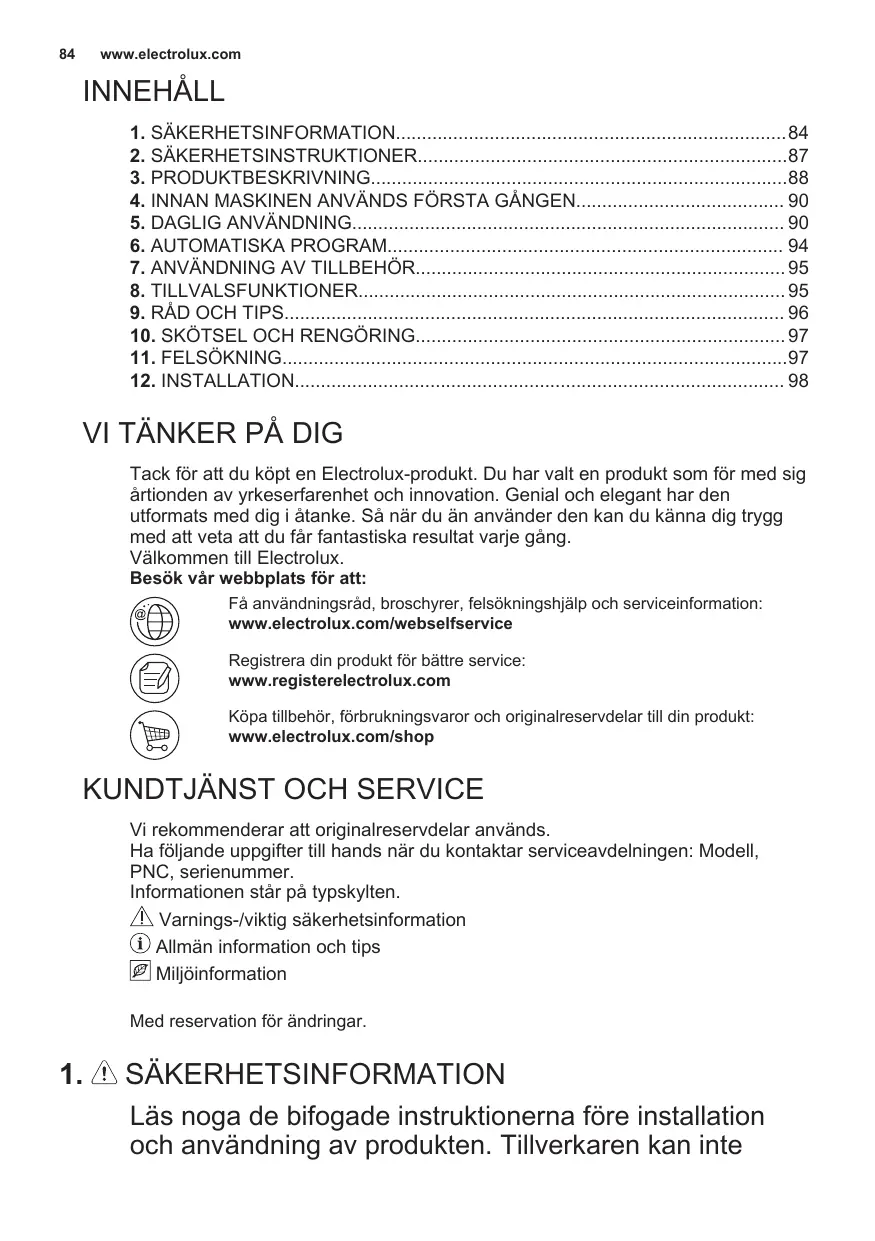 Tack för att du köpt en Electrolux-produkt. Du har valt en produkt som för med sig årtionden av yrkeserfarenhet och innovation. Genial och elegant har den utformats med dig i åtanke. Så när du än använder den kan du känna dig trygg med att veta att du får fantastiska resultat varje gång. Välkommen till Electrolux. Besök vår webbplats för att: Få användningsråd, broschyrer, felsökningshjälp och serviceinformation: www.electrolux.com/webselfservice Registrera din produkt för bättre service: www.registerelectrolux.com Köpa tillbehör, förbrukningsvaror och originalreservdelar till din produkt: www.electrolux.com/shop