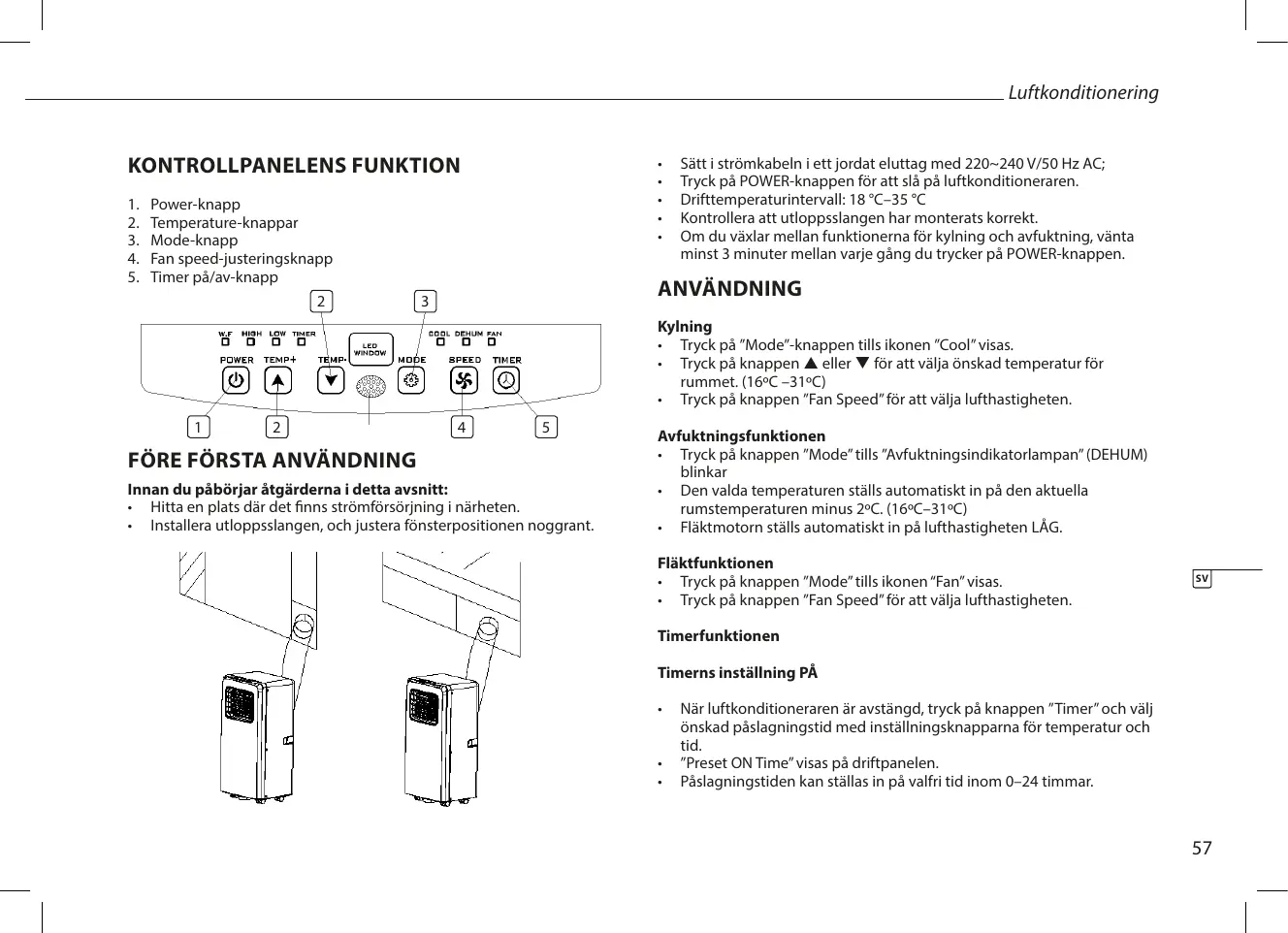 Sätt i strömkabeln i ett jordat eluttag med 220~240 V/50 Hz AC; Tryck på POWER-knappen för att slå på luftkonditioneraren. Drifttemperaturintervall: 18 °C–35 °C Kontrollera att utloppsslangen har monterats korrekt. Om du växlar mellan funktionerna för kylning och avfuktning, vänta minst 3 minuter mellan varje gång du trycker på POWER-knappen. ANVÄNDNING