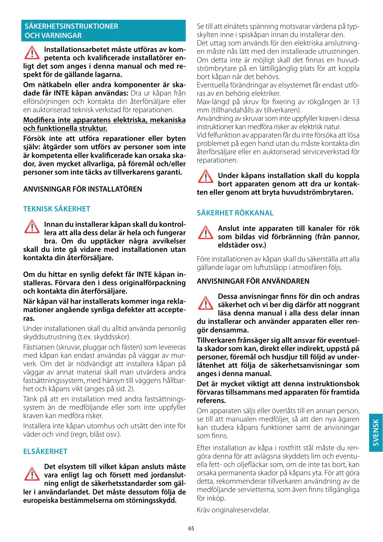 SÄKERHETSINSTRUKTIONER OCH VARNINGAR Se till att elnätets spänning motsvarar värdena på typskylten inne i spiskåpan innan du installerar den. Det uttag som används för den elektriska anslutningen måste nås lätt med den installerade utrustningen. Om detta inte är möjligt skall det finnas en huvudströmbrytare på en lättillgänglig plats för att koppla bort kåpan när det behövs. Eventuella förändringar av elsystemet får endast utföras av en behörig elektriker. Max-längd på skruv för fixering av rökgången är 13 mm (tillhandahålls av tillverkaren). Användning av skruvar som inte uppfyller kraven i dessa instruktioner kan medföra risker av elektrisk natur. Vid felfunktion av apparaten får du inte försöka att lösa problemet på egen hand utan du måste kontakta din återförsäljare eller en auktoriserad serviceverkstad för reparationen. Installationsarbetet måste utföras av kompetenta och kvalificerade installatörer enligt det som anges i denna manual och med respekt för de gällande lagarna. Om nätkabeln eller andra komponenter är skadade får INTE kåpan användas: Dra ur kåpan från elförsörjningen och kontakta din återförsäljare eller en auktoriserad teknisk verkstad för reparationen. Modifiera inte apparatens elektriska, mekaniska och funktionella struktur. Försök inte att utföra reparationer eller byten själv: åtgärder som utförs av personer som inte är kompetenta eller kvalificerade kan orsaka skador, även mycket allvarliga, på föremål och/eller personer som inte täcks av tillverkarens garanti. Under kåpans installation skall du koppla bort apparaten genom att dra ur kontakten eller genom att bryta huvudströmbrytaren.