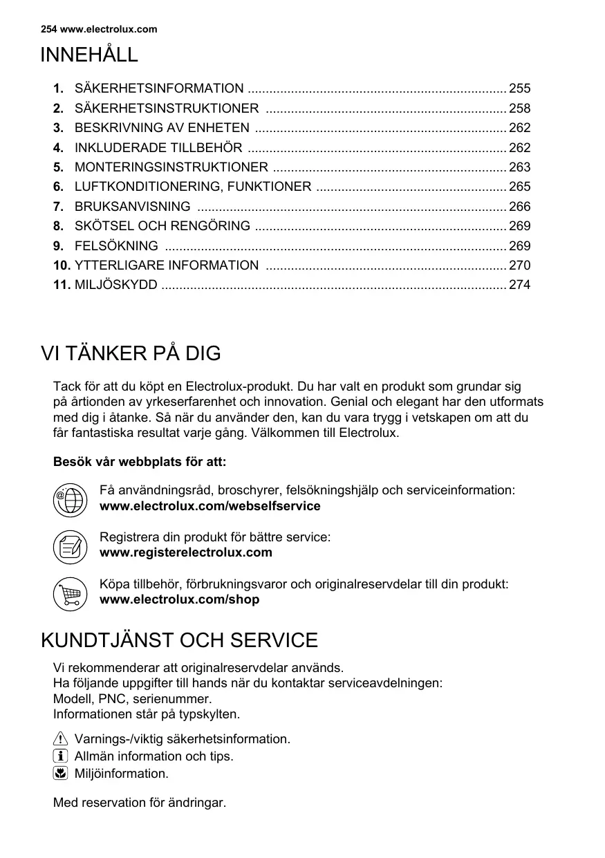 Tack för att du köpt en Electrolux-produkt. Du har valt en produkt som grundar sig på årtionden av yrkeserfarenhet och innovation. Genial och elegant har den utformats med dig i åtanke. Så när du använder den, kan du vara trygg i vetskapen om att du får fantastiska resultat varje gång. Välkommen till Electrolux. Besök vår webbplats för att: Få användningsråd, broschyrer, felsökningshjälp och serviceinformation: www.electrolux.com/webselfservice Registrera din produkt för bättre service: www.registerelectrolux.com Köpa tillbehör, förbrukningsvaror och originalreservdelar till din produkt: www.electrolux.com/shop
