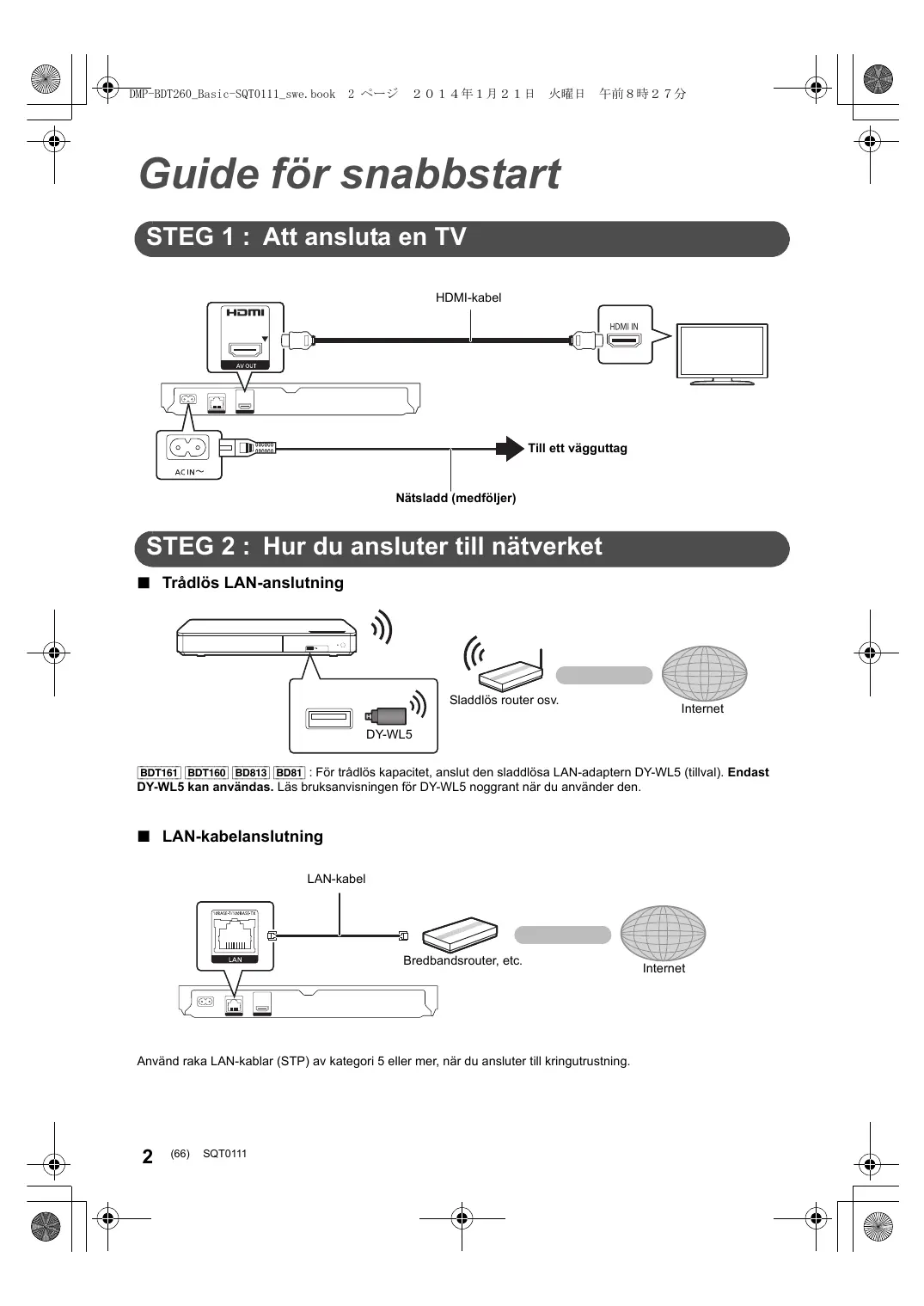 Guide för snabbstart STEG 1 : Att ansluta en TV HDMI-kabel HDMI IN Till ett vägguttag Nätsladd (medföljer) STEG 2 : Hur du ansluter till nätverket ∫ Trådlös LAN-anslutning Sladdlös router osv. Internet DY-WL5 [BDT161] [BDT160] [BD813] [BD81] : För trådlös kapacitet, anslut den sladdlösa LAN-adaptern DY-WL5 (tillval). Endast DY-WL5 kan användas. Läs bruksanvisningen för DY-WL5 noggrant när du använder den. ∫ LAN-kabelanslutning LAN-kabel Bredbandsrouter, etc. Använd raka LAN-kablar (STP) av kategori 5 eller mer, när du ansluter till kringutrustning.