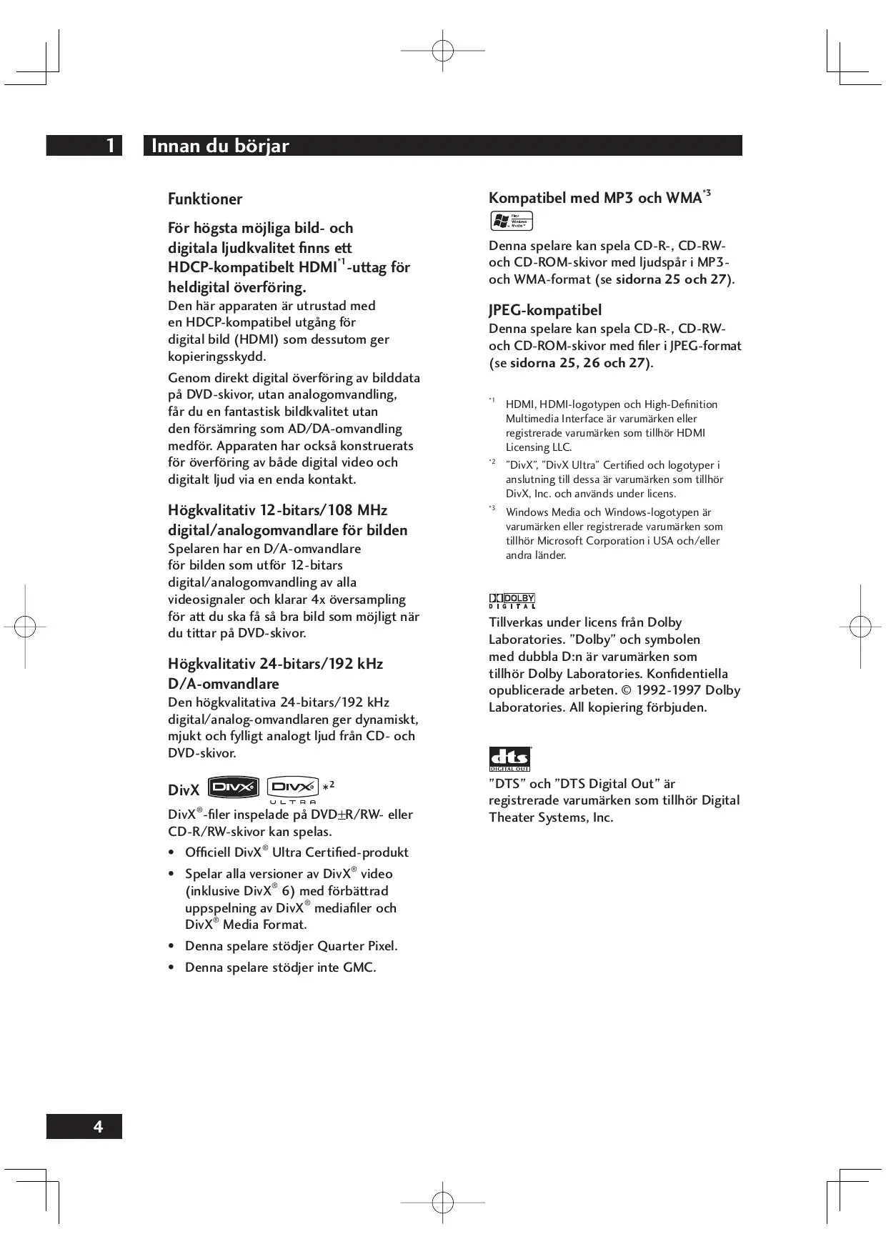 Windows Media och Windows-logotypen är varumärken eller registrerade varumärken som tillhör Microsoft Corporation i USA och/eller andra länder. Tillverkas under licens från Dolby Laboratories. ”Dolby” och symbolen med dubbla D:n är varumärken som tillhör Dolby Laboratories. Konfidentiella opublicerade arbeten. © 1992-1997 Dolby Laboratories. All kopiering förbjuden. ”DTS” och ”DTS Digital Out” är registrerade varumärken som tillhör Digital Theater Systems, Inc. Innan du börjar