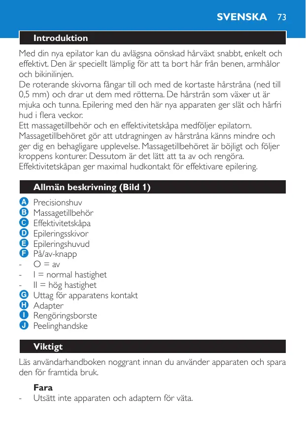 Precisionshuv Massagetillbehör Effektivitetskåpa Epileringsskivor Epileringshuvud På/av-knapp O = av I = normal hastighet II = hög hastighet Uttag för apparatens kontakt Adapter Rengöringsborste Peelinghandske Viktigt Läs användarhandboken noggrant innan du använder apparaten och spara den för framtida bruk.