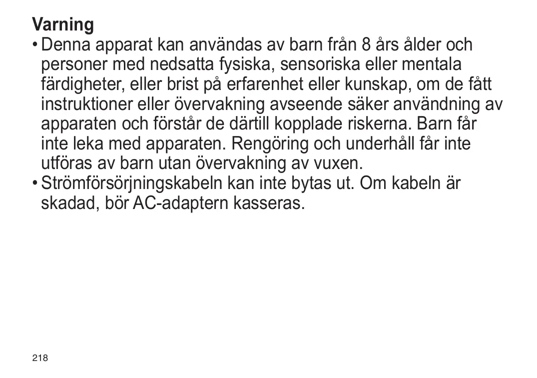 Varning • Denna apparat kan användas av barn från 8 års ålder och personer med nedsatta fysiska, sensoriska eller mentala färdigheter, eller brist på erfarenhet eller kunskap, om de fått instruktioner eller övervakning avseende säker användning av apparaten och förstår de därtill kopplade riskerna. Barn får inte leka med apparaten. Rengöring och underhåll får inte utföras av barn utan övervakning av vuxen. • Strömförsörjningskabeln kan inte bytas ut. Om kabeln är skadad, bör AC-adaptern kasseras.