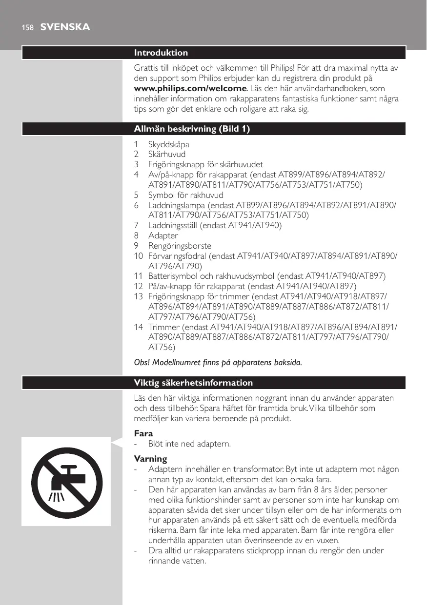 Skyddskåpa Skärhuvud Frigöringsknapp för skärhuvudet Av/på-knapp för rakapparat (endast AT899/AT896/AT894/AT892/ AT891/AT890/AT811/AT790/AT756/AT753/AT751/AT750) Symbol för rakhuvud Laddningslampa (endast AT899/AT896/AT894/AT892/AT891/AT890/ AT811/AT790/AT756/AT753/AT751/AT750) Laddningsställ (endast AT941/AT940) Adapter Rengöringsborste Förvaringsfodral (endast AT941/AT940/AT897/AT894/AT891/AT890/ AT796/AT790) Batterisymbol och rakhuvudsymbol (endast AT941/AT940/AT897) På/av-knapp för rakapparat (endast AT941/AT940/AT897) Frigöringsknapp för trimmer (endast AT941/AT940/AT918/AT897/ AT896/AT894/AT891/AT890/AT889/AT887/AT886/AT872/AT811/ AT797/AT796/AT790/AT756) Trimmer (endast AT941/AT940/AT918/AT897/AT896/AT894/AT891/ AT890/AT889/AT887/AT886/AT872/AT811/AT797/AT796/AT790/ AT756) Obs! Modellnumret finns på apparatens baksida. Viktig säkerhetsinformation Läs den här viktiga informationen noggrant innan du använder apparaten och dess tillbehör. Spara häftet för framtida bruk. Vilka tillbehör som medföljer kan variera beroende på produkt. Fara -- Blöt inte ned adaptern. Varning -- Adaptern innehåller en transformator. Byt inte ut adaptern mot någon annan typ av kontakt, eftersom det kan orsaka fara. -- Den här apparaten kan användas av barn från 8 års ålder, personer med olika funktionshinder samt av personer som inte har kunskap om apparaten såvida det sker under tillsyn eller om de har informerats om hur apparaten används på ett säkert sätt och de eventuella medförda riskerna. Barn får inte leka med apparaten. Barn får inte rengöra eller underhålla apparaten utan överinseende av en vuxen. -- Dra alltid ur rakapparatens stickpropp innan du rengör den under rinnande vatten. SVENSKA 159 -- Kontrollera alltid apparaten och dess tillbehör innan du använder den. Använd inte apparaten om den är skadad eftersom det kan orsaka personskador. Byt alltid ut en skadad del mot en del av originaltyp. Försiktighet -- Sänk aldrig ned laddningsstället i vatten och spola inte av det under kranen. -- Använd apparaten endast till det avsedda ändamålet, som framgår i användarhandboken. -- Av hygieniska skäl bör apparaten endast användas av en person. -- Använd inte adaptern i eller nära vägguttag som innehåller eller har innehållit en elektrisk luftrenare för att förhindra svåra skador på adaptern. -- Använd aldrig tryckluft, skursvampar, slipande rengöringsmedel eller vätskor som bensin eller aceton till att rengöra enheten. -- Det kan droppa vatten från uttaget nedtill på rakapparaten när du sköljer den. Det är normalt och inte farligt, eftersom all elektronik är inkapslad i en försluten strömenhet inuti rakapparaten. Elektromagnetiska fält (EMF) -- Den här Philips-produkten uppfyller alla tillämpliga standarder och regler gällande exponering av elektromagnetiska fält. Allmänt -- Den här rakapparaten är vattentät. Den kan användas i badkaret och duschen och sköljas under kranen. Av säkerhetsskäl kan rakapparaten därför endast användas utan sladd. -- Apparaten är avsedd för nätspänning på 100–240 volt. -- Adaptern omvandlar 100–240 V till en säker låg spänning på under 24 V. -- Max ljudnivå: Lc = 69 dB(A) Laddning Obs! Rakapparaten kan inte drivas direkt från elnätet. När du laddar rakapparaten första gången eller när den inte har använts under en längre period måste den laddas tills laddningslampan lyser med fast sken. I nedanstående tabell anges rakapparatens laddningstid. Laddningstid 1-timmes 8 timmar AT941, AT940, AT918 AT899, AT896, AT872 AT897, AT896, AT894 AT797, AT796, AT790 AT892, AT891, AT890 AT770, AT756, AT753 AT889, AT887, AT886 AT751, AT750 AT811 Raktiden kan vara kortare än vad som anges i tabellen nedan, beroende på rakningsvanor, rengöringsvanor eller skäggtyp.