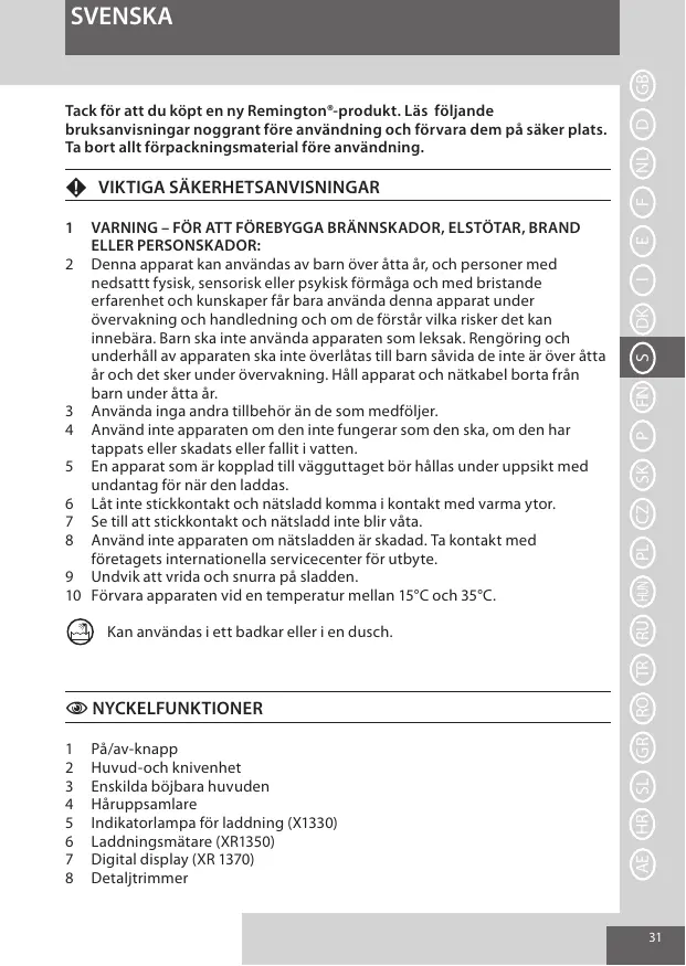 Tack för att du köpt en ny Remington®-produkt. Läs följande bruksanvisningar noggrant före användning och förvara dem på säker plats. Ta bort allt förpackningsmaterial före användning.