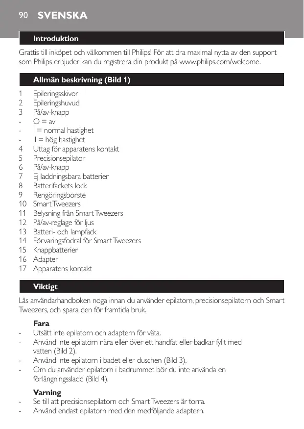 Använd inte epilatorn, precisionsepilatorn, Smart Tweezers eller adaptern om de är skadade. Om adaptern är skadad ska den alltid ersättas med en av originaltyp för att farliga situationer inte ska uppstå. Kontrollera att den nätspänning som anges på adaptern motsvarar den lokala nätspänningen innan du ansluter epilatorn. Byt inte ut adaptern mot någon annan typ av kontakt, eftersom det medför en risk. Epilatorn, precisionsepilatorn och Smart Tweezers är inte avsedda för användning av personer (inklusive barn) med olika funktionshinder, eller av personer som inte har kunskap om hur de används, om de inte övervakas eller får instruktioner angående användning av apparaterna av en person som är ansvarig för deras säkerhet. Barn bör inte leka med epilatorn, precisionsepilatorn eller Smart Tweezers. Håll Smart Tweezers knappbatterier utom räckhåll för barn och sällskapsdjur. Knappbatterierna kan utgöra kvävningsrisk. Varning! Epilatorn är bara avsedd för borttagning av kvinnors benbehåring. Precisionsepilatorn är avsedd för epilering av kvinnors kroppsbehåring i bikini- och armhåleområdet samt på svåråtkomliga ställen som knä och fotled. Använd inte apparaterna i annat syfte. Av hygieniska skäl bör epilatorn, precisionsepilatorn och Smart Tweezers endast användas av en person. Undvik skador genom att hålla apparaterna borta från hår, ögonbryn, ögonfransar, kläder, trådar, sladdar, borstar och liknande när de är igång. Använd inte apparaterna och Smart Tweezers på hud som är irriterad, har åderbråck eller är finnig, eller på leverfläckar (med hår) eller skadad hud utan att först tala med din läkare. Personer med nedsatt immunförsvar och personer med diabetes, blödarsjuka eller immunbrist ska också först tala med läkare. Din hud kan bli lite röd och irriterad de första gångerna du använder epilatorn eller precisionsepilatorn. Det är helt normalt och går snabbt över. Allt eftersom du använder epilatorn vänjer huden sig, hudirritationen minskar och återväxten blir tunnare och mjukare. Om irritationen inte går över på tre dagar rekommenderar vi dig att uppsöka läkare. Använd inte epileringshuvudena om de är skadade eller trasiga, eftersom det kan orsaka skada. Utsätt inte epilatorn för temperaturer lägre än 5 °C eller högre än 35 °C. Använd endast precisionsepilatorn med icke laddningsbara 1,5 V alkaliska AA-batterier. Använd endast Smart Tweezers med alkaliska knappbatterier av typen L736H eller AG3 (dia. 7,8 x 3,4 mm). Epilatorns ljudnivå (Lw) är 72 dB(A). Precisionsepilatorns ljudnivå (Lw) är 75dB(A).