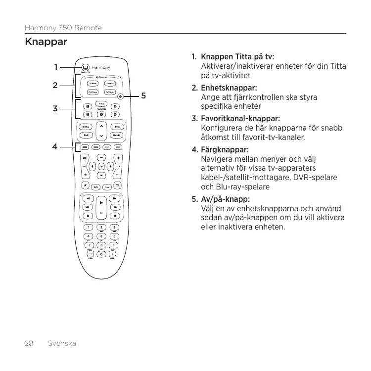 Configurez ces boutons pour accéder rapidement à vos chaînes TV préférées. 4. Boutons de couleur: Naviguez dans les menus et sélectionnez des options sur certains téléviseurs, récepteurs câble/satellite, enregistreurs numériques et lecteurs Blu-ray. 5. Bouton d'alimentation: Sélectionnez un bouton Dispositif, puis utilisez le bouton d'alimentation pour mettre le dispositif correspondant sous ou hors tension.