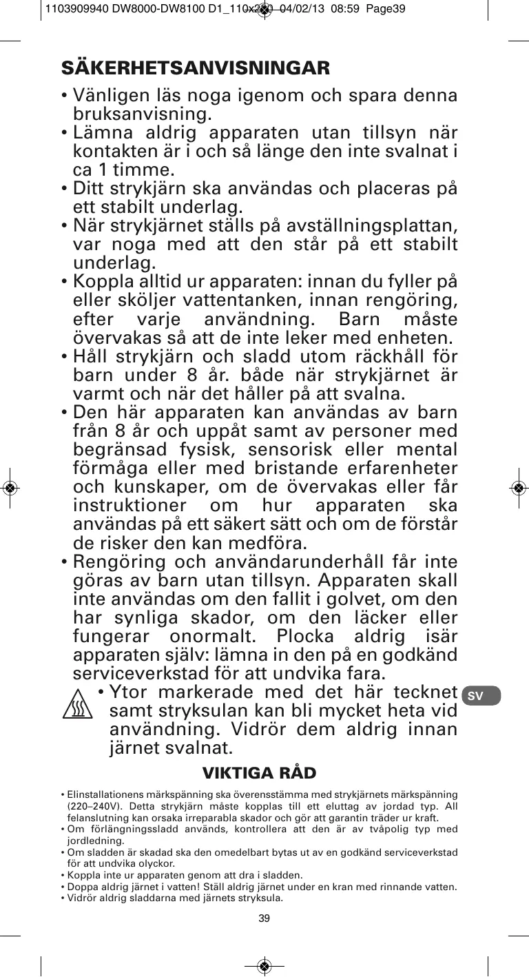 Téléchargez la notice de votre Strykjärn au format PDF gratuitement ! Retrouvez votre notice DW8115D1 - ROWENTA et reprennez votre appareil électronique en main. Sur cette page sont publiés tous les documents nécessaires à l'utilisation de votre appareil DW8115D1 de la marque ROWENTA.