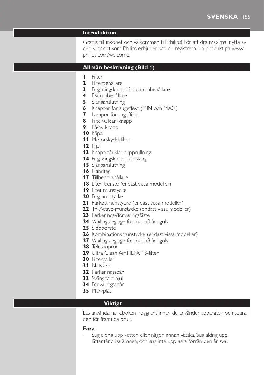 Svenska Varning -- Kontrollera att den spänning som anges på apparaten överensstämmer med den lokala nätspänningen innan du ansluter apparaten. -- Använd inte apparaten om stickkontakten, nätsladden eller själva apparaten är skadad. -- Om nätsladden är skadad måste den alltid bytas ut av Philips, något av Philips auktoriserade serviceombud eller liknande behöriga personer för att undvika olyckor. -- Apparaten är inte avsedd för användning av personer (inklusive barn) med olika funktionshinder, eller av personer som inte har kunskap om hur apparaten används, om de inte övervakas eller får instruktioner angående användning av apparaten av en person som är ansvarig för deras säkerhet. -- Små barn ska övervakas så att de inte kan leka med apparaten. -- Rikta inte slangen, röret eller annat tillbehör mot ögon eller öron och stoppa dem inte i munnen när de är anslutna till dammsugaren och den är påslagen. Varning! -- Sug inte upp stora föremål eftersom det kan orsaka luftstopp i röret eller slangen. -- När du använder dammsugaren till att suga upp aska, fin sand, kalk, cementdamm och liknande ämnen täpps filtret igen. Om du märker att sugeffekten försämras betydligt ska du rengöra filtret. -- Uppsugning av större föremål kan orsaka stopp i röret eller slangen. Om det inträffar måste föremålet tas bort. -- Använd aldrig dammsugaren utan motorskyddsfiltret. Apparatens motor kan då skadas och livslängden förkortas. -- Filtret är inte vattentätt och får inte rengöras med vatten eller rengöringsmedel. Filtret får endast rengöras med Filter-Clean-systemet. -- Använd endast Philips-filtret som medföljer apparaten. -- Under dammsugningen, särskilt i rum med låg luftfuktighet, byggs det upp statisk elektricitet i dammsugaren. Därför kan du få stötar när du rör vid röret eller någon annan av dammsugarens metalldelar. Stötarna är inte skadliga för dig och skadar heller inte apparaten. Men för att undvika problemet kan du göra följande: 1 ladda ur apparaten från statiskt elektricitet genom att regelbundet hålla röret mot andra metallföremål i rummet (till exempel bords- eller stolsben, element osv.) 2 höja luftfuktigheten i rummet genom att placera vatten i rummet. Du kan t.ex. hänga behållare med vatten på elementen eller ställa skålar med vatten på eller nära elementen.