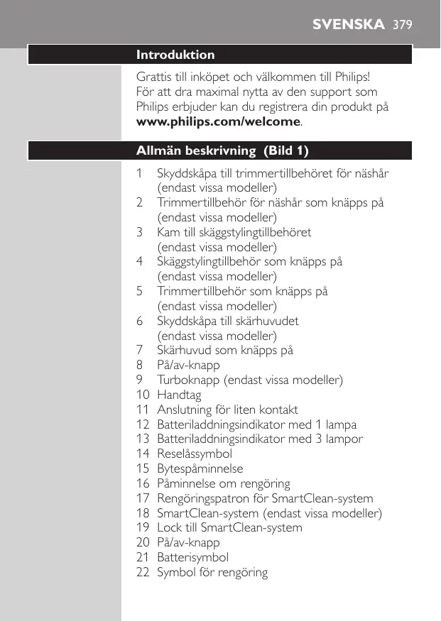 SVENSKA 379 Introduktion Grattis till inköpet och välkommen till Philips! För att dra maximal nytta av den support som Philips erbjuder kan du registrera din produkt på www.philips.com/welcome. Allmän beskrivning (Bild 1) 1 2 3 4 5 6 7 8 9 10 11 12 13 14 15 16 17 18 19 20 21 22
