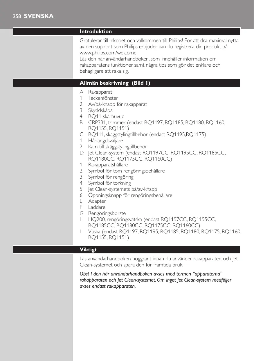 E F G H I Rakapparat Teckenfönster Av/på-knapp för rakapparat Skyddskåpa RQ11-skärhuvud CRP331, trimmer (endast RQ1197, RQ1185, RQ1180, RQ1160, RQ1155, RQ1151) RQ111, skäggstylingtillbehör (endast RQ1195,RQ1175) Hårlängdsväljare Kam till skäggstylingtillbehör Jet Clean-system (endast RQ1197CC, RQ1195CC, RQ1185CC, RQ1180CC, RQ1175CC, RQ1160CC) Rakapparatshållare Symbol för tom rengöringsbehållare Symbol för rengöring Symbol för torkning Jet Clean-systemets på/av-knapp Öppningsknapp för rengöringsbehållare Adapter Laddare Rengöringsborste HQ200, rengöringsvätska (endast RQ1197CC, RQ1195CC, RQ1185CC, RQ1180CC, RQ1175CC, RQ1160CC) Väska (endast RQ1197, RQ1195, RQ1185, RQ1180, RQ1175, RQ1160, RQ1155, RQ1151)