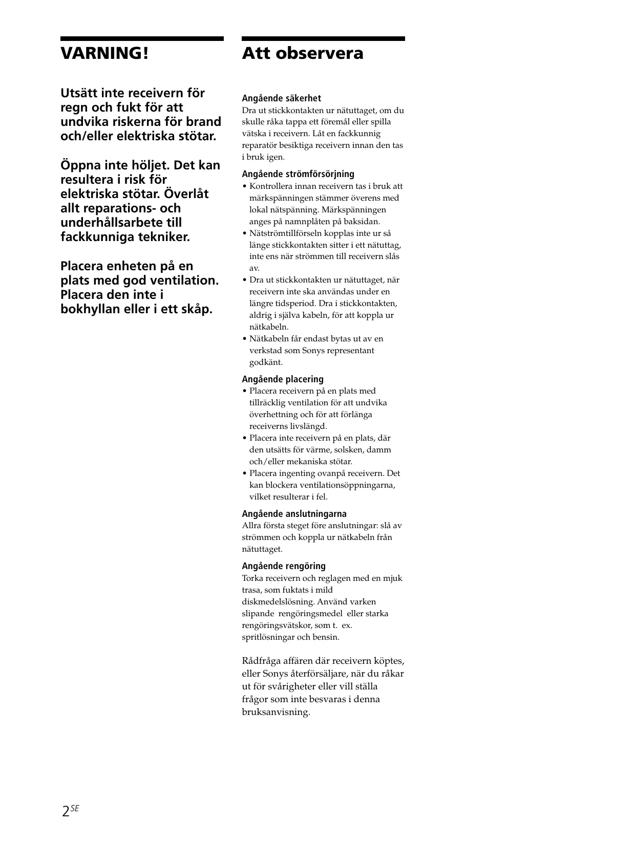 Si un solide ou un liquide tombait dans le coffret, débranchez l’ampli-tuner et faitesle vérifier par un technicien qualifié avant de le remettre en service.