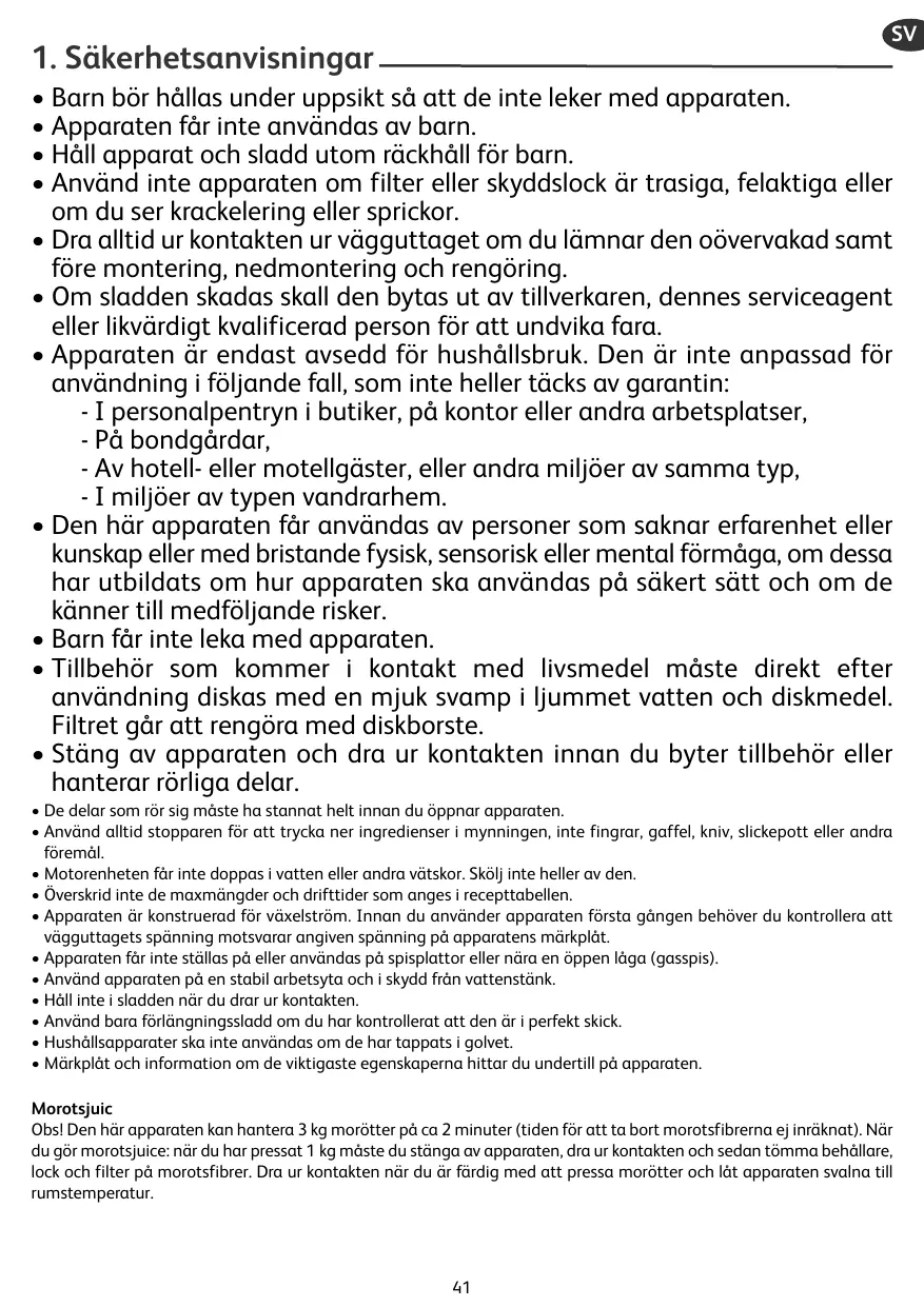 • Barn bör hållas under uppsikt så att de inte leker med apparaten. • Apparaten får inte användas av barn. • Håll apparat och sladd utom räckhåll för barn. • Använd inte apparaten om filter eller skyddslock är trasiga, felaktiga eller om du ser krackelering eller sprickor. • Dra alltid ur kontakten ur vägguttaget om du lämnar den oövervakad samt före montering, nedmontering och rengöring. • Om sladden skadas skall den bytas ut av tillverkaren, dennes serviceagent eller likvärdigt kvalificerad person för att undvika fara. • Apparaten är endast avsedd för hushållsbruk. Den är inte anpassad för användning i följande fall, som inte heller täcks av garantin: - I personalpentryn i butiker, på kontor eller andra arbetsplatser, - På bondgårdar, - Av hotell- eller motellgäster, eller andra miljöer av samma typ, - I miljöer av typen vandrarhem. • Den här apparaten får användas av personer som saknar erfarenhet eller kunskap eller med bristande fysisk, sensorisk eller mental förmåga, om dessa har utbildats om hur apparaten ska användas på säkert sätt och om de känner till medföljande risker. • Barn får inte leka med apparaten. • Tillbehör som kommer i kontakt med livsmedel måste direkt efter användning diskas med en mjuk svamp i ljummet vatten och diskmedel. Filtret går att rengöra med diskborste. • Stäng av apparaten och dra ur kontakten innan du byter tillbehör eller hanterar rörliga delar. • De delar som rör sig måste ha stannat helt innan du öppnar apparaten. • Använd alltid stopparen för att trycka ner ingredienser i mynningen, inte fingrar, gaffel, kniv, slickepott eller andra föremål. • Motorenheten får inte doppas i vatten eller andra vätskor. Skölj inte heller av den. • Överskrid inte de maxmängder och drifttider som anges i recepttabellen. • Apparaten är konstruerad för växelström. Innan du använder apparaten första gången behöver du kontrollera att vägguttagets spänning motsvarar angiven spänning på apparatens märkplåt. • Apparaten får inte ställas på eller användas på spisplattor eller nära en öppen låga (gasspis). • Använd apparaten på en stabil arbetsyta och i skydd från vattenstänk. • Håll inte i sladden när du drar ur kontakten. • Använd bara förlängningssladd om du har kontrollerat att den är i perfekt skick. • Hushållsapparater ska inte användas om de har tappats i golvet. • Märkplåt och information om de viktigaste egenskaperna hittar du undertill på apparaten. Morotsjuic Obs! Den här apparaten kan hantera 3 kg morötter på ca 2 minuter (tiden för att ta bort morotsfibrerna ej inräknat). När du gör morotsjuice: när du har pressat 1 kg måste du stänga av apparaten, dra ur kontakten och sedan tömma behållare, lock och filter på morotsfibrer. Dra ur kontakten när du är färdig med att pressa morötter och låt apparaten svalna till rumstemperatur.