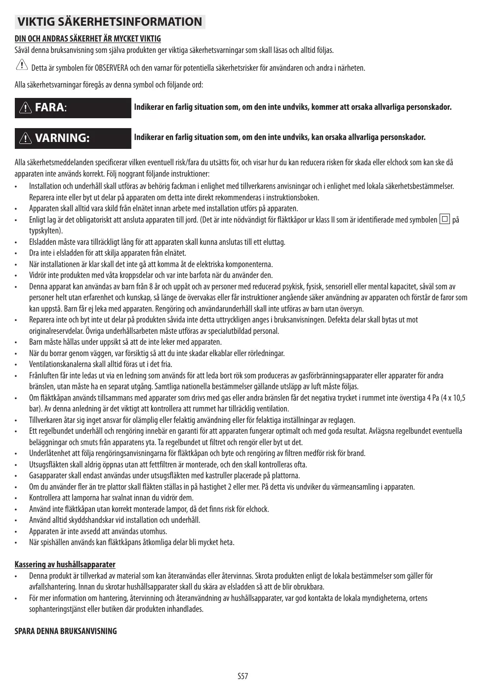 • Si se utilizan más de tres fuegos de gas al mismo tiempo, la campana debe funcionar a potencia 2 o superior. De este modo se evita la concentración excesiva de calor en el aparato. • Antes de tocar las bombillas, compruebe que estén frías. • Asegúrese de que las bombillas estén correctamente montadas y de lo contrario no utilice la campana, ya que existe el riesgo de descarga eléctrica. • Todas las operaciones de instalación y mantenimiento se deben realizar con guantes de trabajo. • El producto no es idóneo para el uso al aire libre. • Las partes accesibles de la campana se pueden recalentar durante el funcionamiento de la placa de cocción. Eliminación de aparatos electrodomésticos • Este producto está fabricado con material reciclable o reutilizable. Desguácelo de conformidad con las normas locales para la eliminación de residuos. Antes de desecharlo, corte el cable de alimentación. • Para más información sobre el tratamiento, la recuperación y el reciclado de electrodomésticos, consulte a su ayuntamiento, al servicio de eliminación de residuos urbanos o la tienda donde adquirió el producto. CONSERVE ESTAS INSTRUCCIONES E29