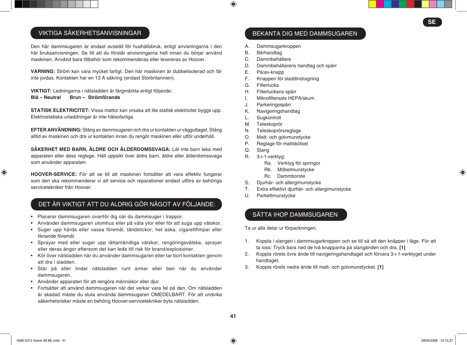 C. Bac à poussière D. Poignée et loquet de verrouillage de bac à poussière E. Commutateur Marche/Arrêt F. Bouton d'enroulement du cordon G. Trappe de filtre H. Loquet de verrouillage de trappe de filtre I. Jeu de filtres HEPA/microfiltre en mousse J. Position parking K. Poignée de guidage L. Sécurité des enfants, des personnes âgées et infirmes : Ne pas laisser les enfants jouer avec l'appareil ou ses commandes. Veuillez superviser les enfants, les personnes âgées ou infirmes lorsqu’ils utilisent l’aspirateur . SERVICE HOOVER : Pour assurer l’utilisation sûre et efficace de cet appareil, nous recommandons de ne faire effectuer l’entretien et les réparations que par un réparateur Hoover agréé.
