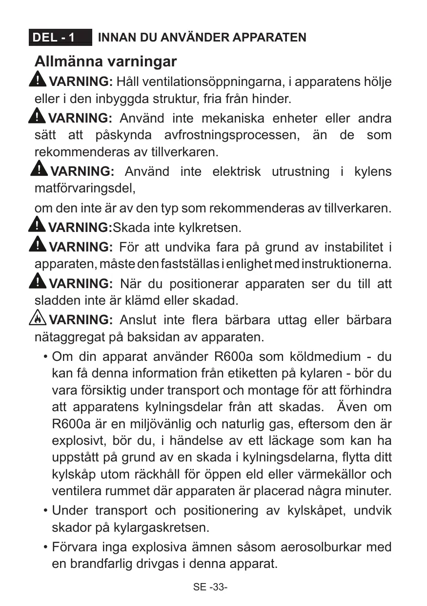 Allmänna varningar VARNING: Håll ventilationsöppningarna, i apparatens hölje eller i den inbyggda struktur, fria från hinder. VARNING: Använd inte mekaniska enheter eller andra sätt att påskynda avfrostningsprocessen, än de som rekommenderas av tillverkaren. VARNING: Använd inte elektrisk utrustning i kylens matförvaringsdel, om den inte är av den typ som rekommenderas av tillverkaren. VARNING:Skada inte kylkretsen. VARNING: För att undvika fara på grund av instabilitet i apparaten, måste den fastställas i enlighet med instruktionerna. VARNING: När du positionerar apparaten ser du till att sladden inte är klämd eller skadad. VARNING: Anslut inte flera bärbara uttag eller bärbara nätaggregat på baksidan av apparaten.
