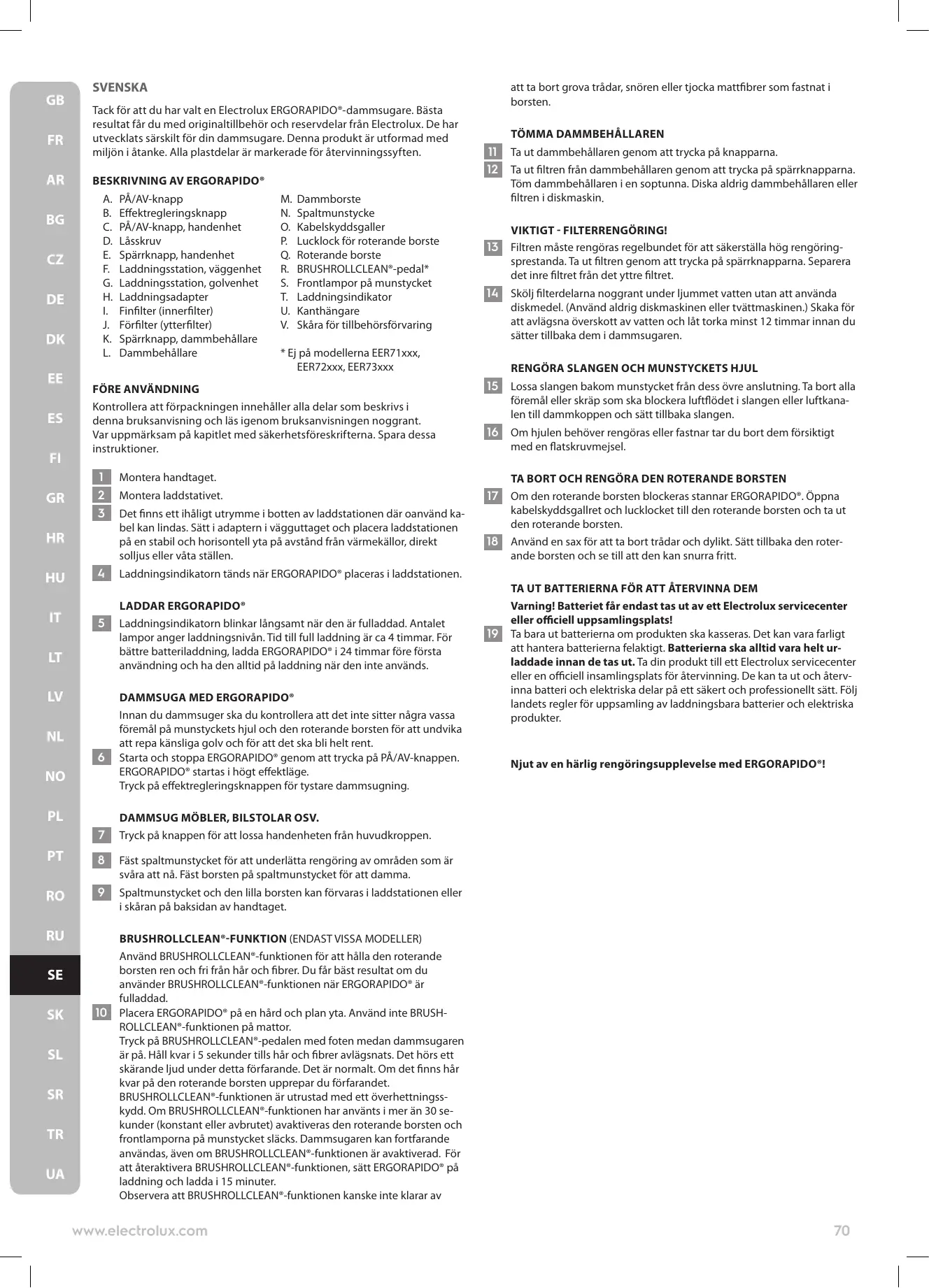 TR UA GB FR AR BG CZ DE DK EE ES FI GR SVENSKA Tack för att du har valt en Electrolux ERGORAPIDO®-dammsugare. Bästa resultat får du med originaltillbehör och reservdelar från Electrolux. De har utvecklats särskilt för din dammsugare. Denna produkt är utformad med miljön i åtanke. Alla plastdelar är markerade för återvinningssyften. BESKRIVNING AV ERGORAPIDO® A. B. C. D. E. F. G. H. I. J. K. L.